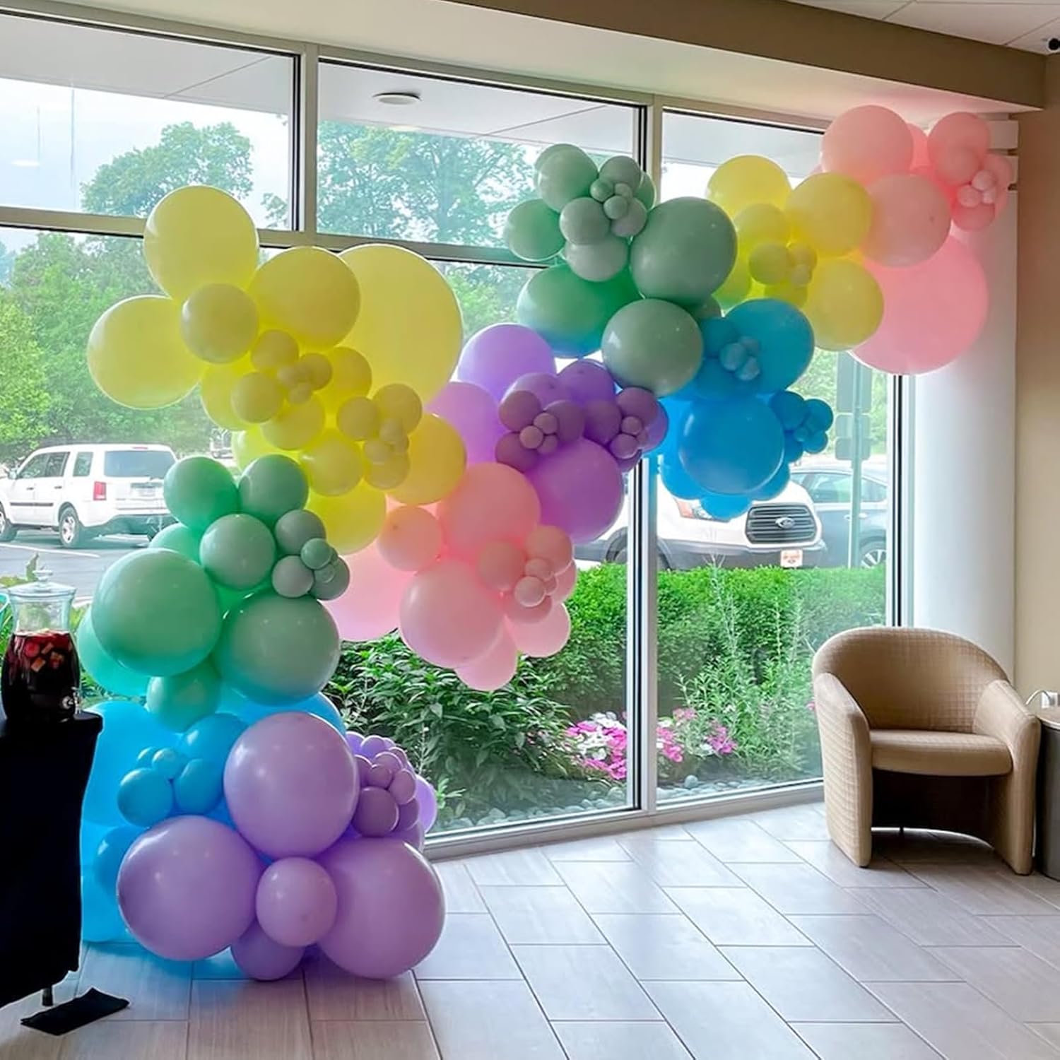 - 【Pastel Balloon Garland Arch Kit】 Each sets contains 132pcs pastel party balloons with different size of 6 colors (yellow, blue, green, pink, purple, teal) and a roll of 16ft garland strip and glue dots. The right amount quantity and most suitable color for each party decoration.