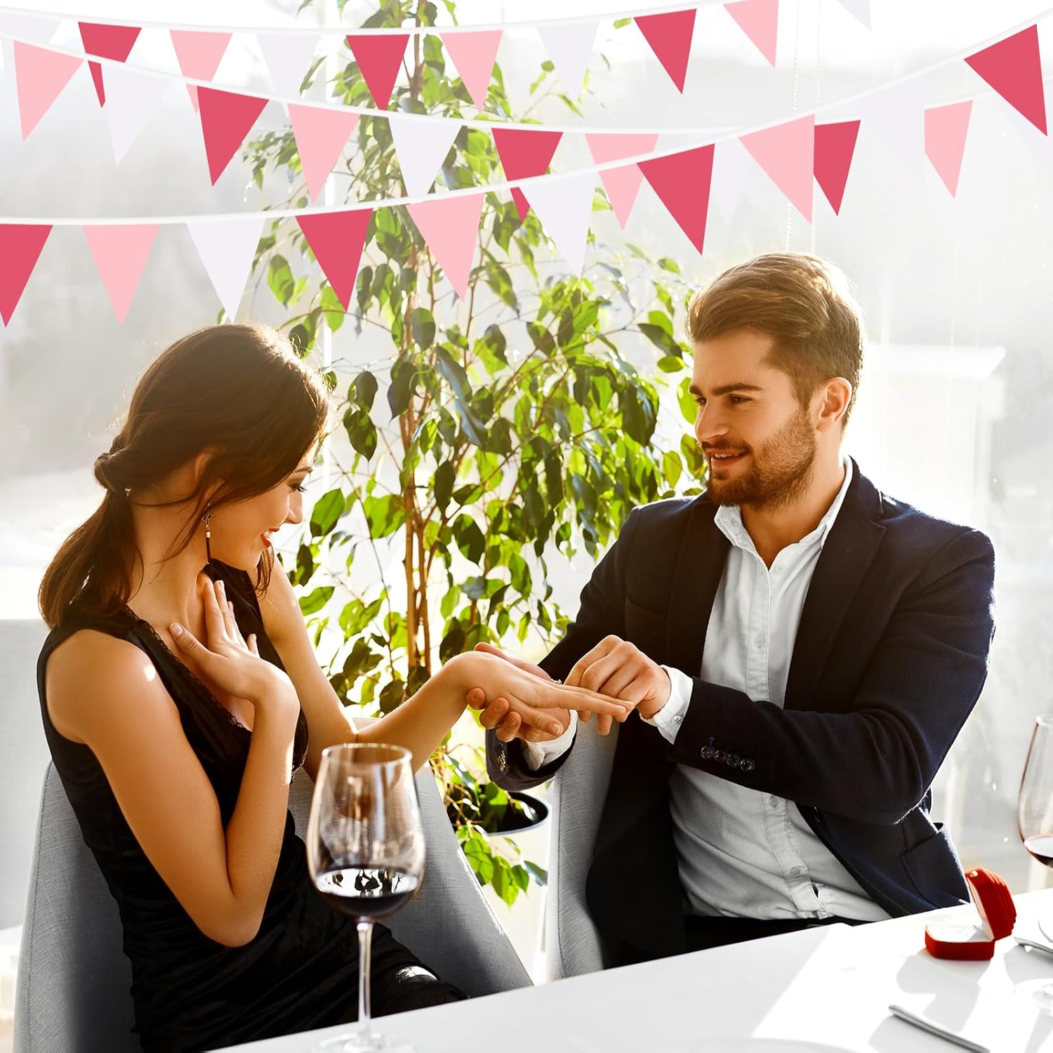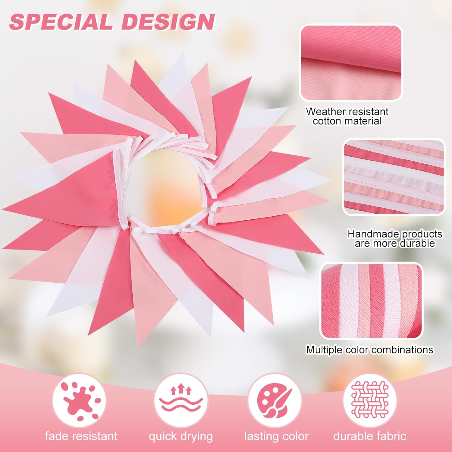 - Eye-Catching Design: The triangle flags create a festive and celebratory atmosphere with their bright pink color and pennant shape.