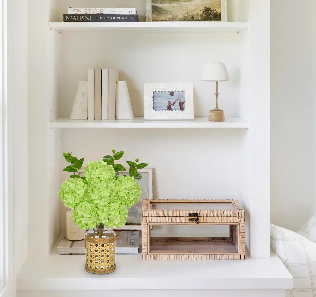 - Premium Quality Materials: The faux hydrangeas flowers with stems and greenery are crafted from high-quality silk and plastic for a realistic texture and vibrant color that never fades. The clear woven glass vase with faux water adds a charming, offering long-lasting beauty with no maintenance