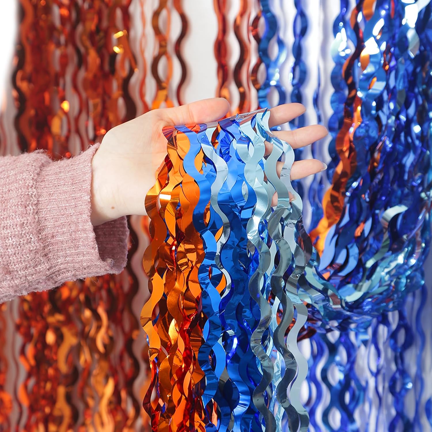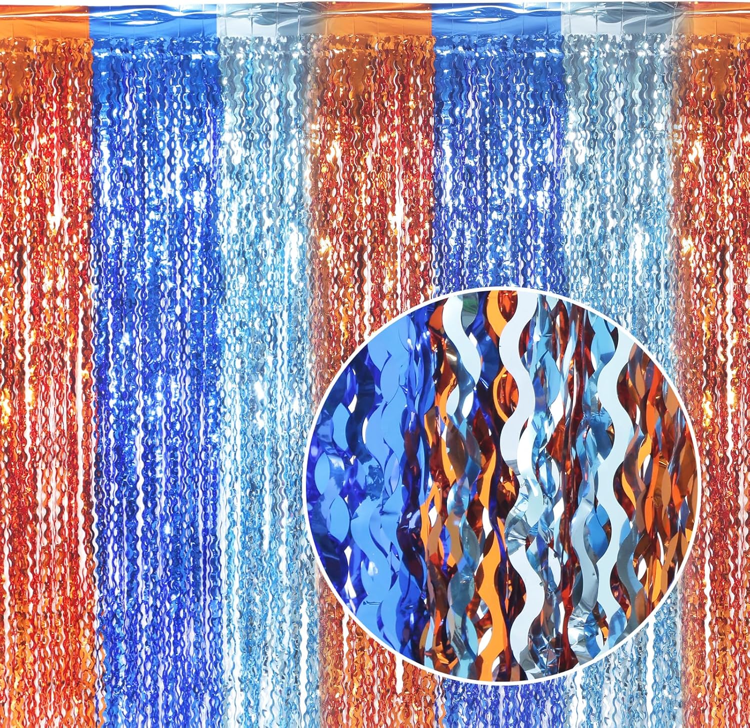- LATEST 3 Color Orange Blue and Navy Wavy Shape Tinsel Backdrop: The foil curtain backdrop is made of aluminium foil with shiny surface wavy shape, good for adding sparkle as decorations for parties