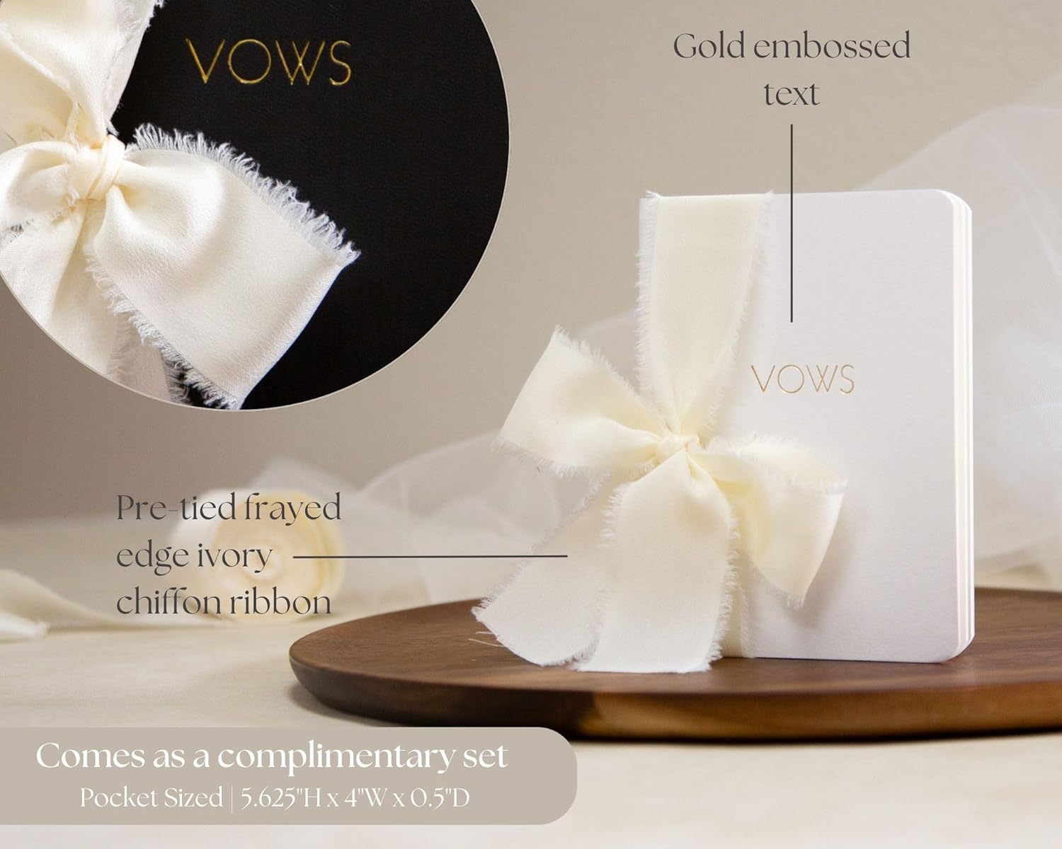 - Each vow book in our set measures 5.625 x 4 x .5 inches, making them pocket-sized for easy carrying. Crafted from high-quality materials, these softcover vow books offer durability with a sophisticated finish. The flowy ivory ribbon adds a touch of romance and softness against the texture of the book.