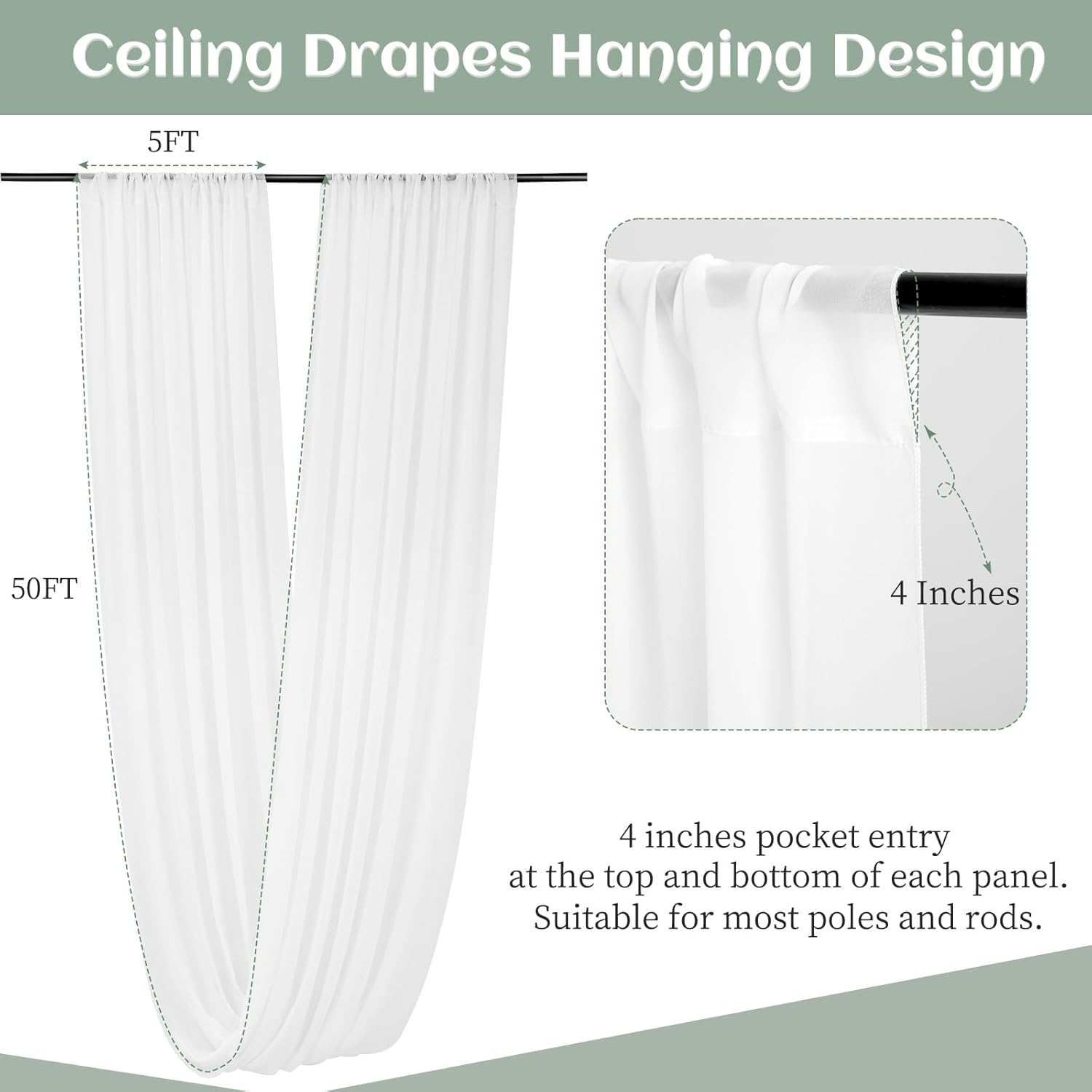 - 🥂Chiffon Ceiling Drapes: The package include 6 panels white wedding ceiling drapes (without hanging pieces). Each wedding extra long curtain measure for 5 feet width x 50 feet length. The sufficient quantity can meet your demands for decorating your weddings, parties, receptions. It will help to create a delicate and aesthetic sense to your wedding ceiling decoration.