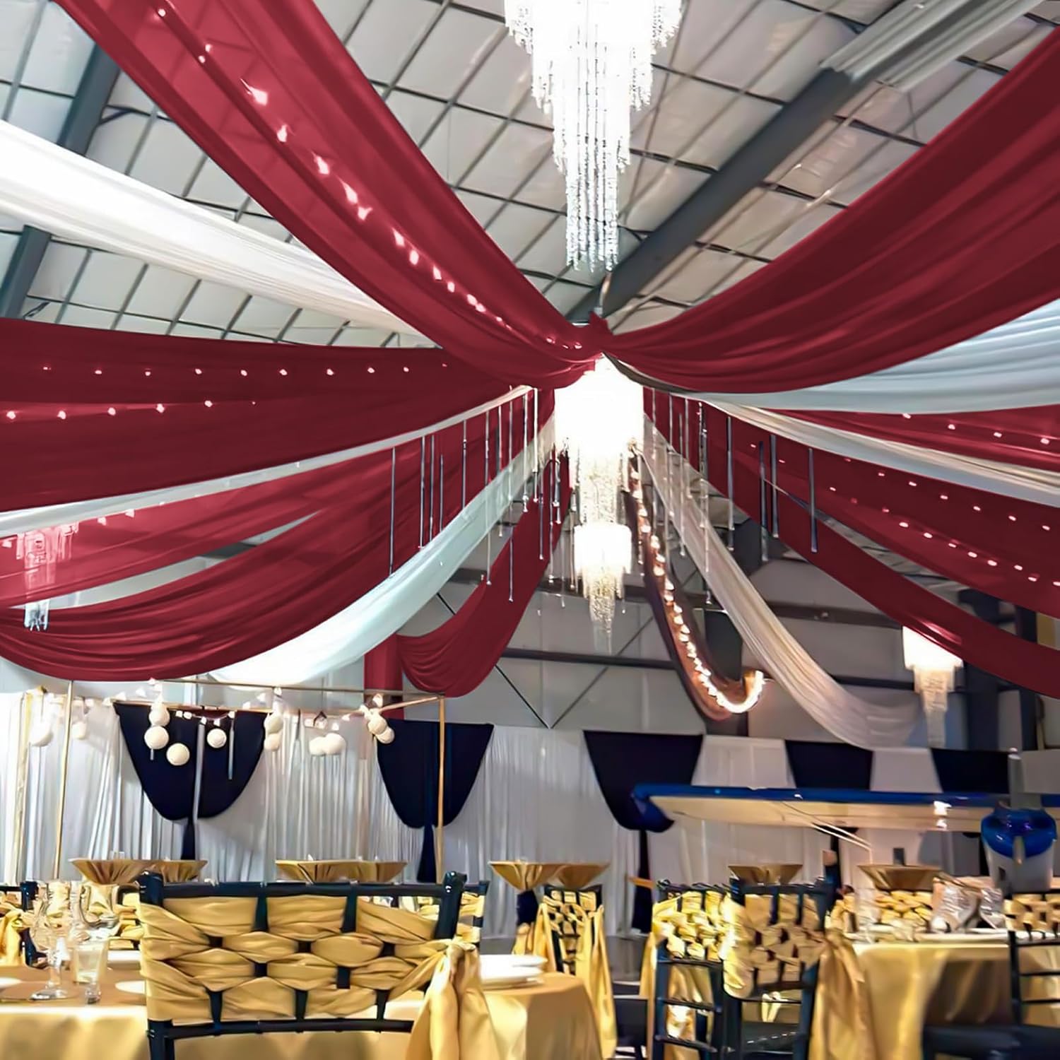 - Chiffon Ceiling Drapes: The package include 6 panels burgundy wedding ceiling drapes (without hanging pieces). Each wedding extra long curtain measure for 5 feet width x 20 feet length. The sufficient quantity can meet your demands for decorating your weddings, parties, receptions. It will help to create a delicate and aesthetic sense to your wedding ceiling decoration.