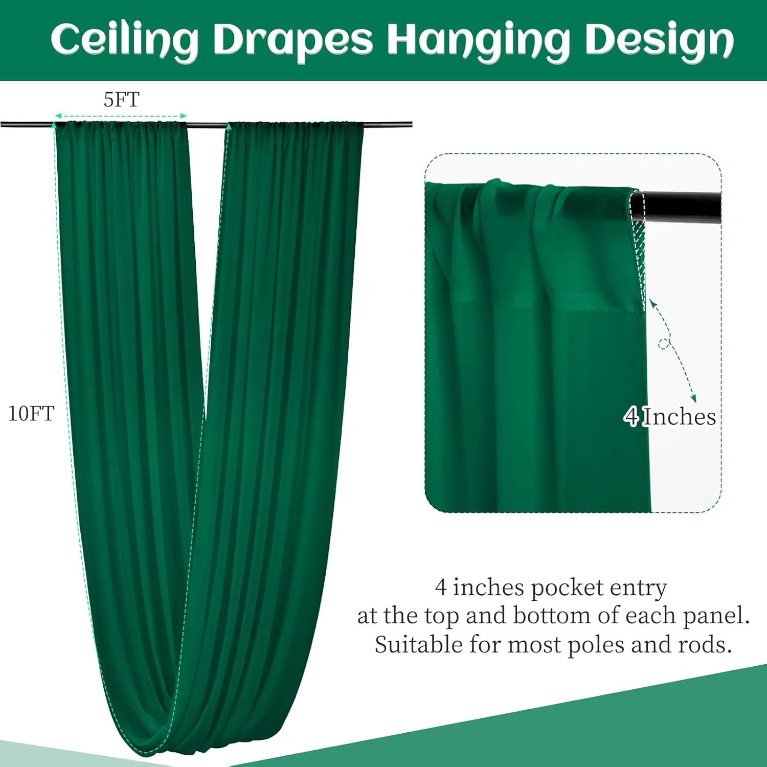 - Chiffon Ceiling Drapes: The package include 6 panels emerald green wedding ceiling drapes (without hanging pieces). Each wedding extra long curtain measure for 5 feet width x 10 feet length. The sufficient quantity can meet your demands for decorating your weddings, parties, receptions. It will help to create a delicate and aesthetic sense to your wedding ceiling decoration.