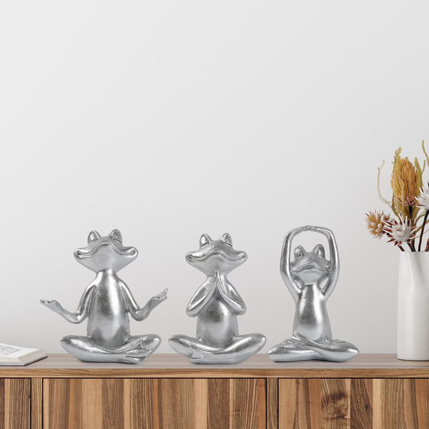 Silver Frog Figurines Yoga Decor Set of 3 –Frog Yoga Statues for Modern Living Room Table Office Bookshelf Shelves Home Sculptures Decor, for Mom Dad Women