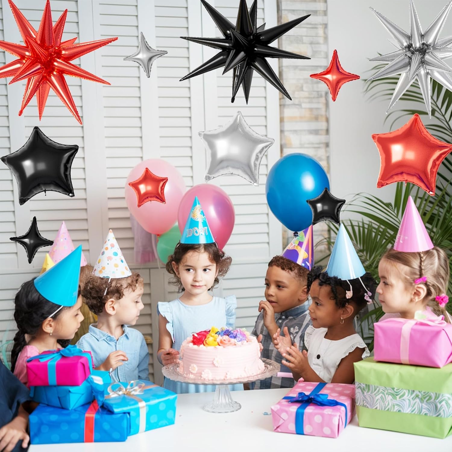 - 【Red Black Silver Star Balloons】The package includes:6pcs 22-inch Star-Shape balloons(Red*2,Black*2,Silver*2), 4pcs 10-inch Four-Pointed Star balloons(Red*2,Black*1,Silver*1), 3pcs 18-inch Five-Pointed Star balloons(Red*1,Black*1,Silver*1), 3pcs 10-inch Five-Pointed Star Shape balloons(Red*1,Black*1,Silver*1),1 dispense and 1 straw. These foil star balloons are Great for birthdays, weddings, baby showers, and engagement parties