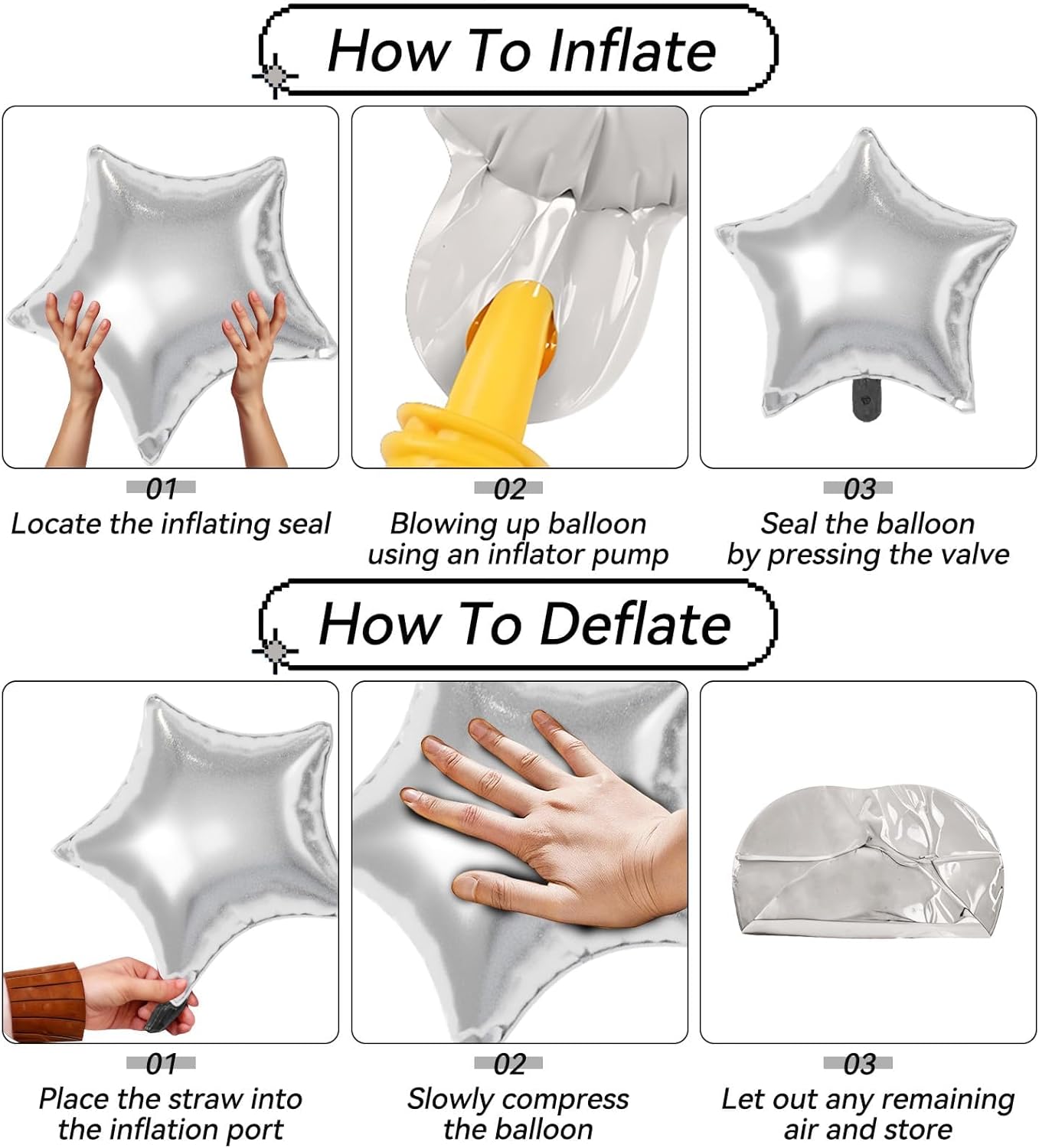 - 【Effortless Setup】Inflate with helium or air using a pump and secure easily for polished decor. These Silver Star Foil balloons are simple to assemble and reusable for multiple events, making decorating quick and effortless.