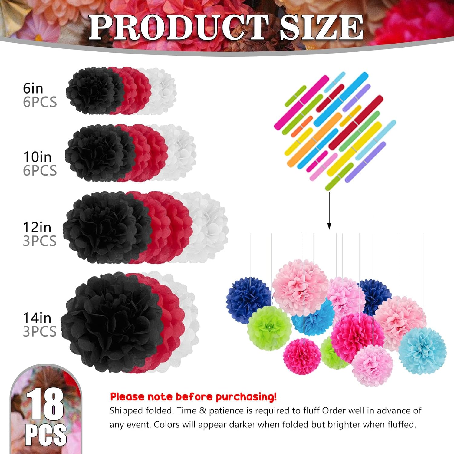 - 【Large Set】18 Pieces paper flower balls include 6 of 6-inch, 6 of 10-inch, 3 of 12-inch, and 3 of extra-large 14 inch paper pom pom flowers.This tissue flower set comes in 3 different colors including red,black,white, which will add charm to your celebration through different color combinations.
