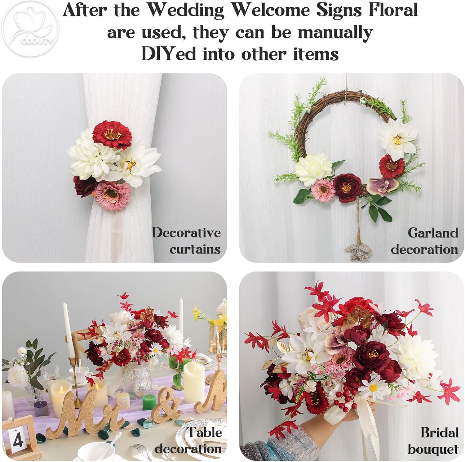 - 🌷 Suitable Scene:Our Odouzy artificial flowers are so versatile that they can be perfectly integrated into any style of wedding scene, whether it is an elegant indoor wedding, a romantic outdoor wedding, a fresh beach wedding or a solemn church wedding, which can show extraordinary harmony. This bouquet is not only suitable for the decoration of the wedding entrance, but also as a finishing touch on the wedding arch. In the birthday party or ceremonial occasion, the arch bouquet can also add a bright color to the welcome area with its unique charm.