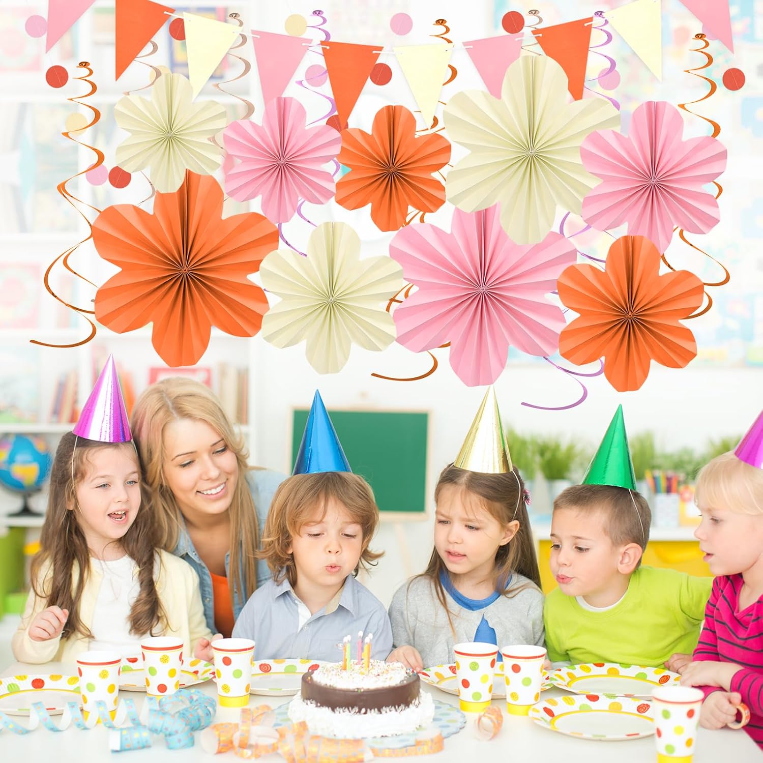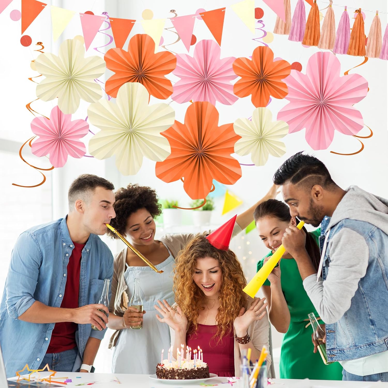 - Orange Party Decorations: Our pink and orange paper fans decorations kit includes 3 pcs 12’’ paper flowers, 3 pcs 10’’ paper flowers, 3 pcs 8’’ paper flowers, 9 pcs hanging swirls, 1 pcs 6.56ft tasseled garland, 1 pcs 6.56ft triangular pennants, 2 pcs circle dot garland, 2 pcs ribbon.