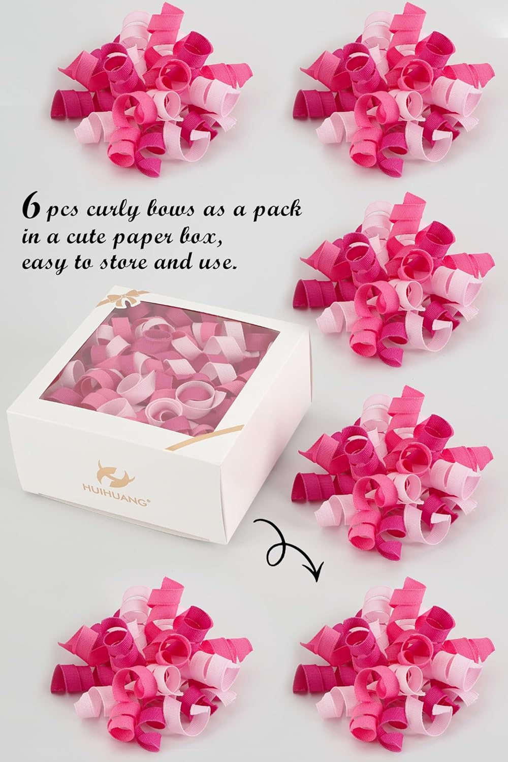 - SIZE & PACK: Each package contains 6 pcs mixed color fushcia/light pink/hot pink curly bows are made of 12 strands of 3/8"(9mm) wide grosgrain ribbon that measure about 5 inch