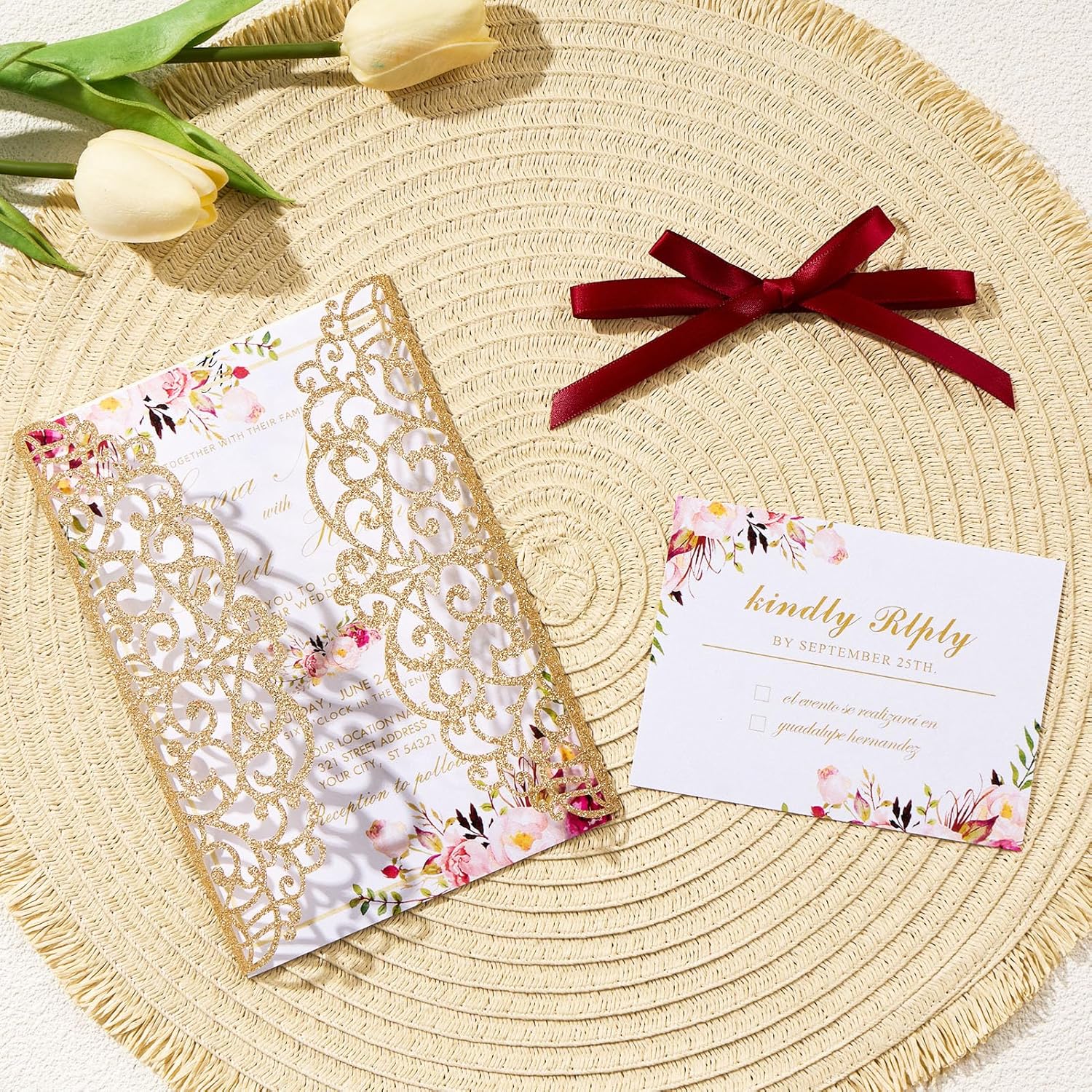 25pcs Personalized Wedding Invitations with Envelopes and RSVP Cards Blank Rose Gold 5×7 Glitter Laser Cut Invitation Pockets for Wedding Engagement Bridal Shower Birthday Quinceañera Anniversary