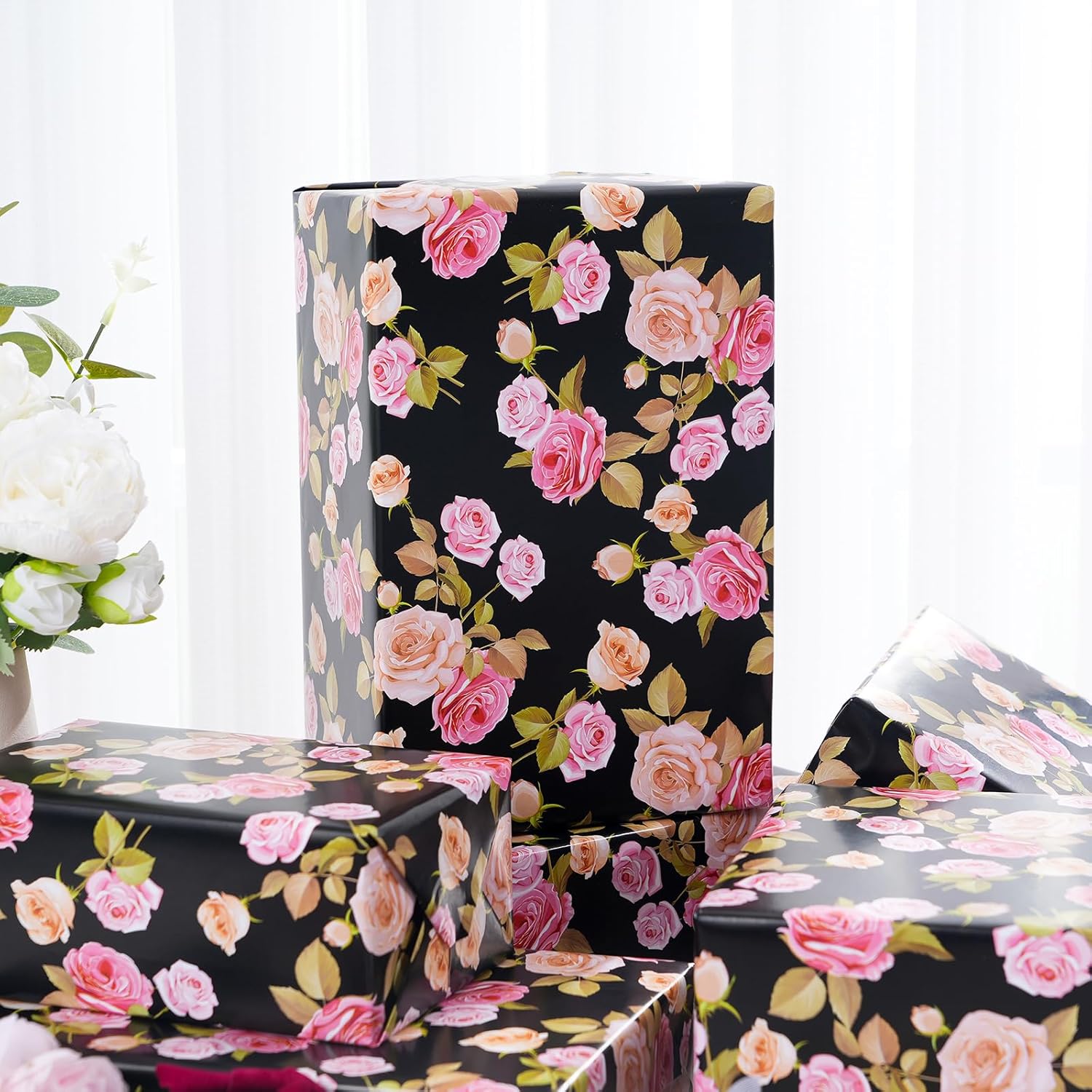 - ELEGANT DESIGN: An array of beautifully illustrated roses in soft pink and cream hues set against a rich black background. Classic and modern wrapping paper is sure to make your gift stand out with elegance and romantic.