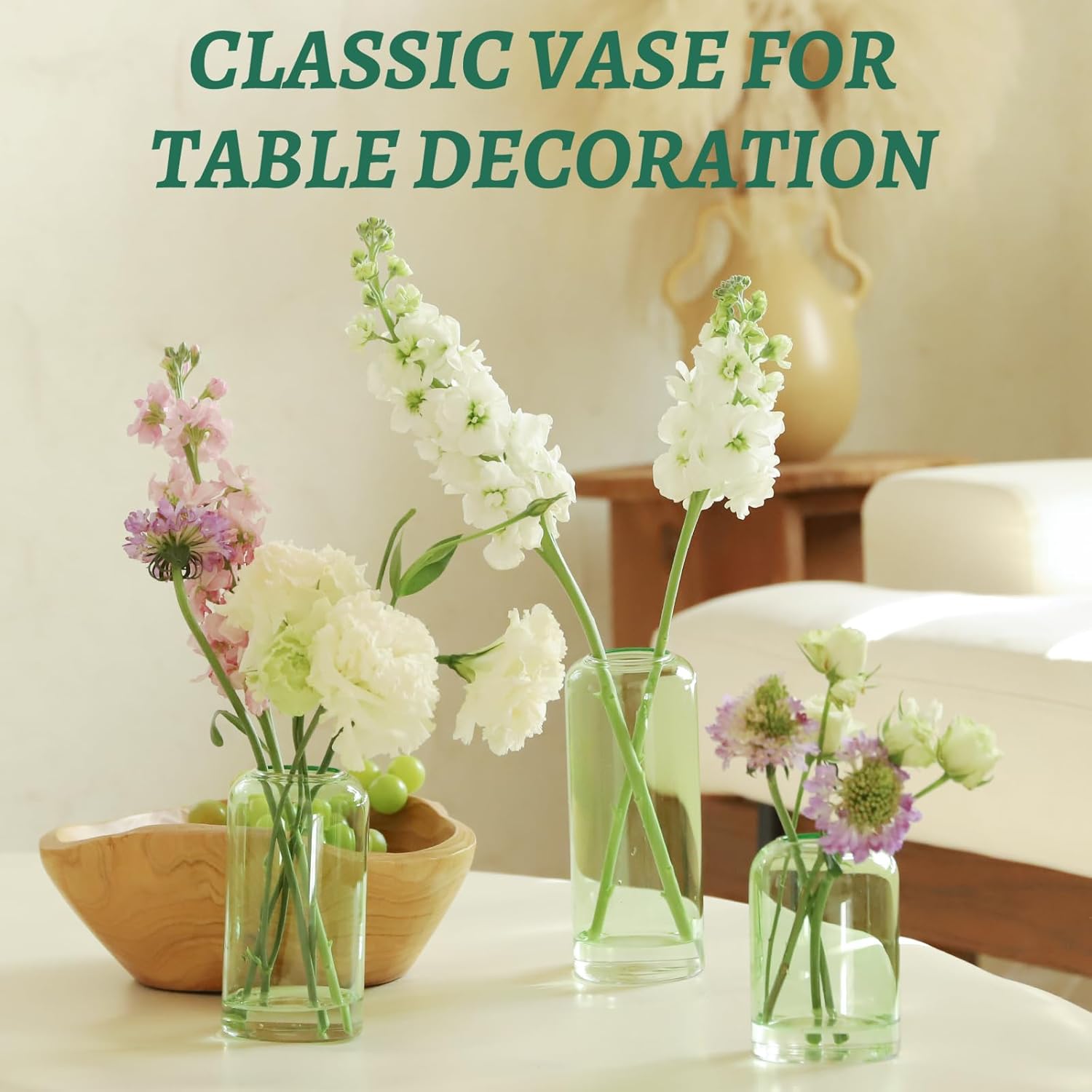 - Quality & Safety: Green glass bud vases is made of selected premium thick borosilicate glass,hand-blown to a bright and high transparent finish with durable and sturdy. The top of the vase is smooth with no sharp edges, ensuring safety during the flower arrangement process. Note: Remember to add an appropriate amount of water according to the quantity and weight of the flowers for stability.