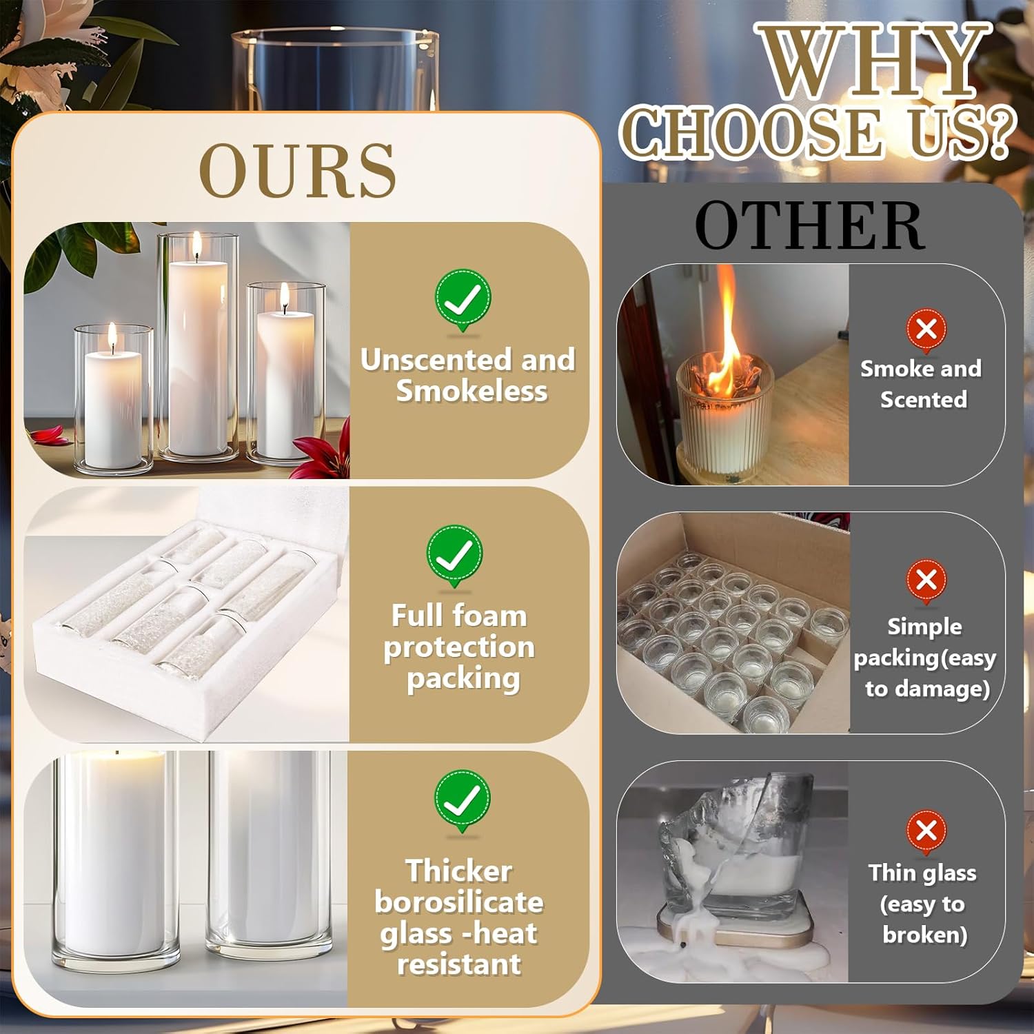 - 【Premium Quality Pillar Candle Holders】Our pillar candles with glass candle holsers are made from high borosilicate glass, which is exquisite workmanship, smooth bottle mouth edge,the pillar candles is made of unscented wax which is no dripping, no fogging or fragrance.