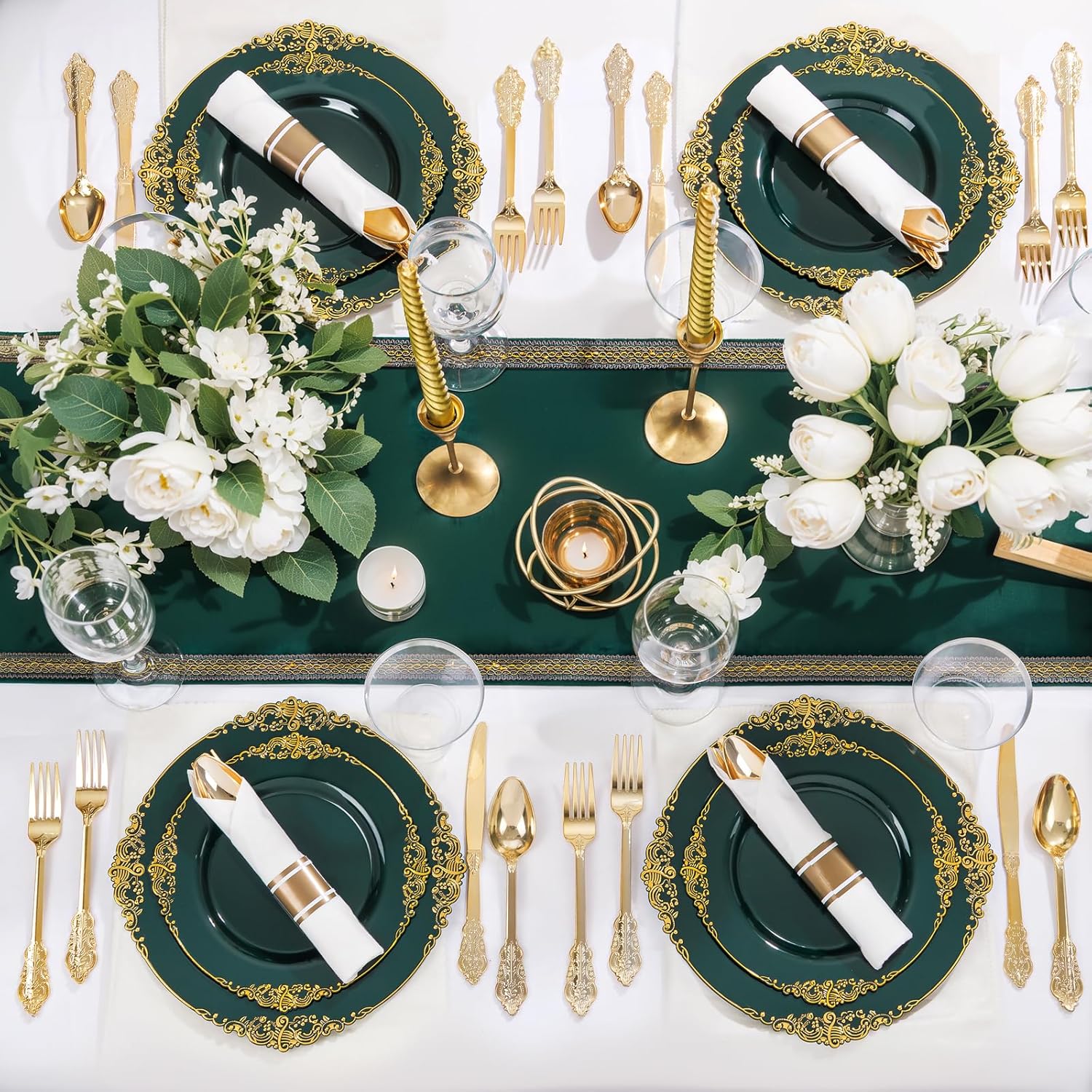 - Serves for 50 Guests - This green and gold plates set includes 50 dinner plates, 50 dessert plates, 50 cups, 50 napkins, and 150 pieces of silverware (50 knives, 50 forks, and 50 spoons), making it ideal for gatherings of up to 50 Guests