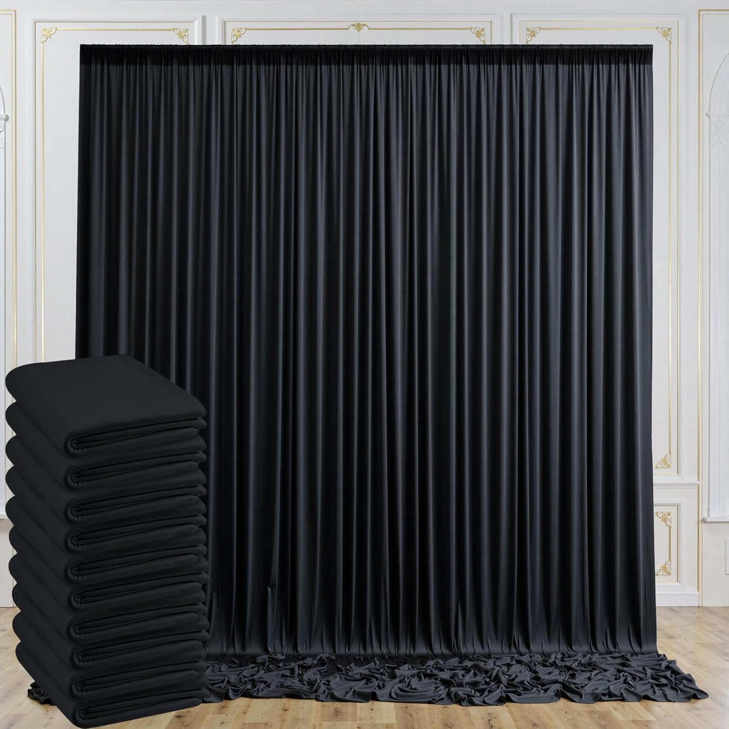 - 10ft Fabric Drape Black Backdrop Curtain Wide Compatibility: Polyester photo drape black backdrop curtain can be used for parties, baby shower, wedding, birthday party, photography, bridal shower, gender reveal, zoom, princess party, engagement party, baptism, candy buffets, dessert table, sweet table, background, photo booths, photoshoot, ceremony, anniversary, graduation, home decorations, holiday party, stage curtain or just to mask unsightly areas
