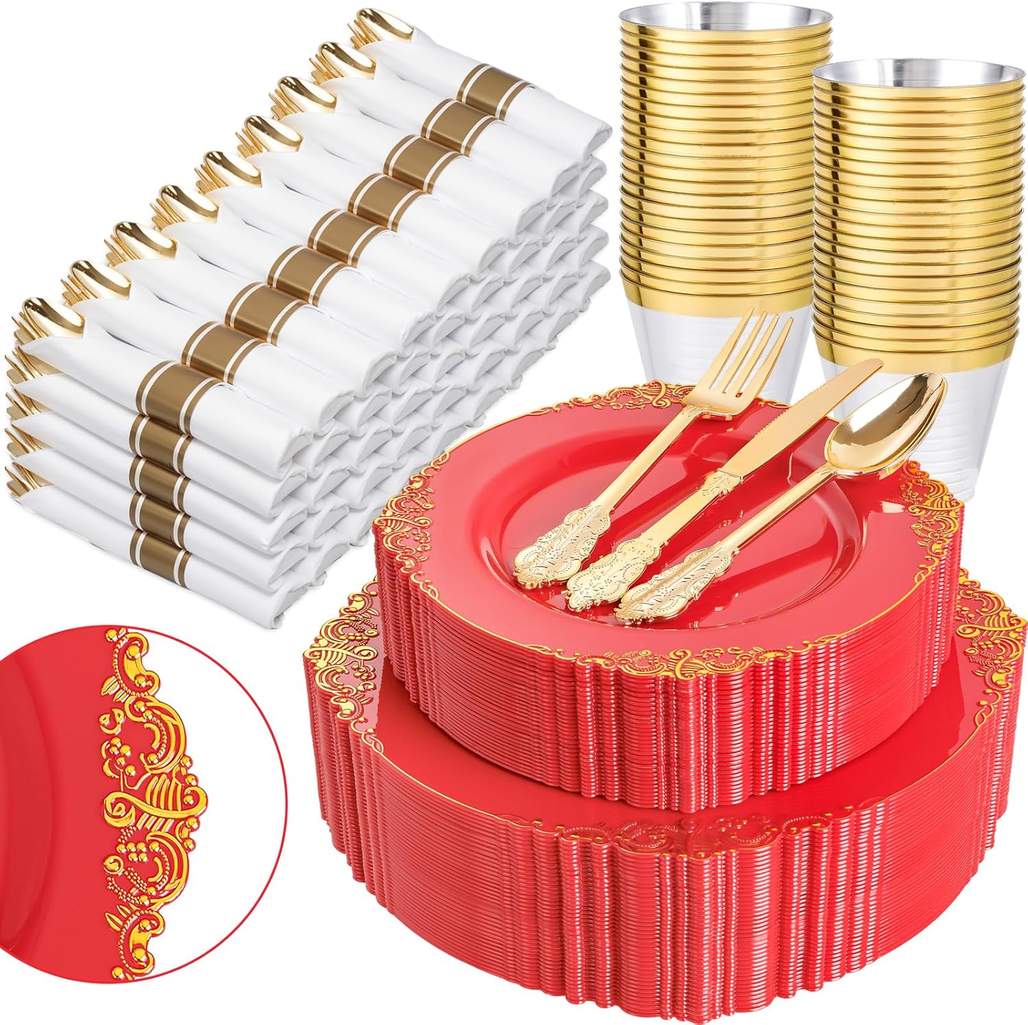 - Serves for 50 Guests - This red and gold plates set includes 50 dinner plates, 50 dessert plates, 50 cups, 50 napkins, and 150 pieces of silverware (50 knives, 50 forks, and 50 spoons), making it ideal for gatherings of up to 50 Guests