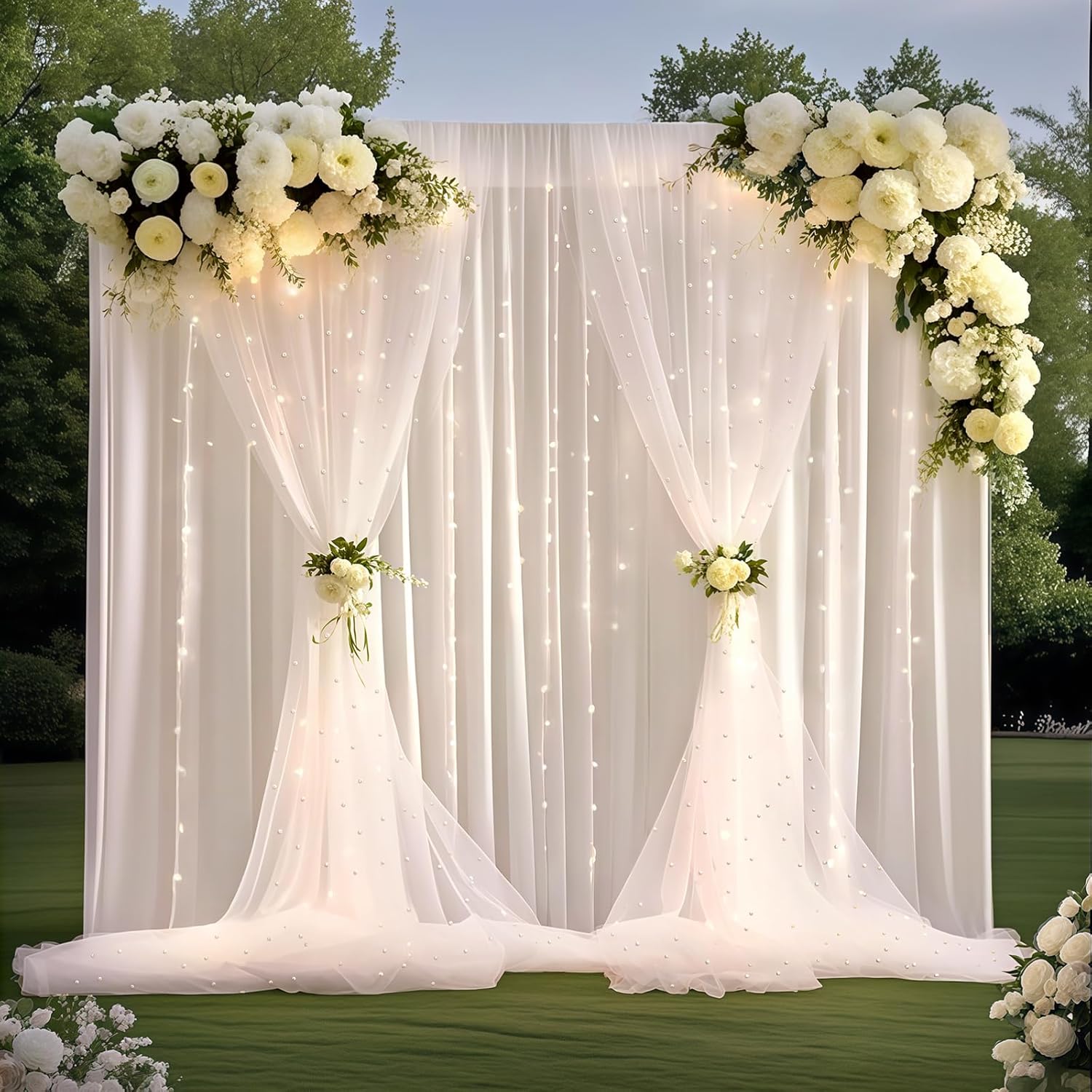 - Includes: 2 panels of 5*8 FT wrinkle-free white pearl sheer tulle backdrop curtain, a set of 10-foot warm-colored string lights, and 12 clear clips.