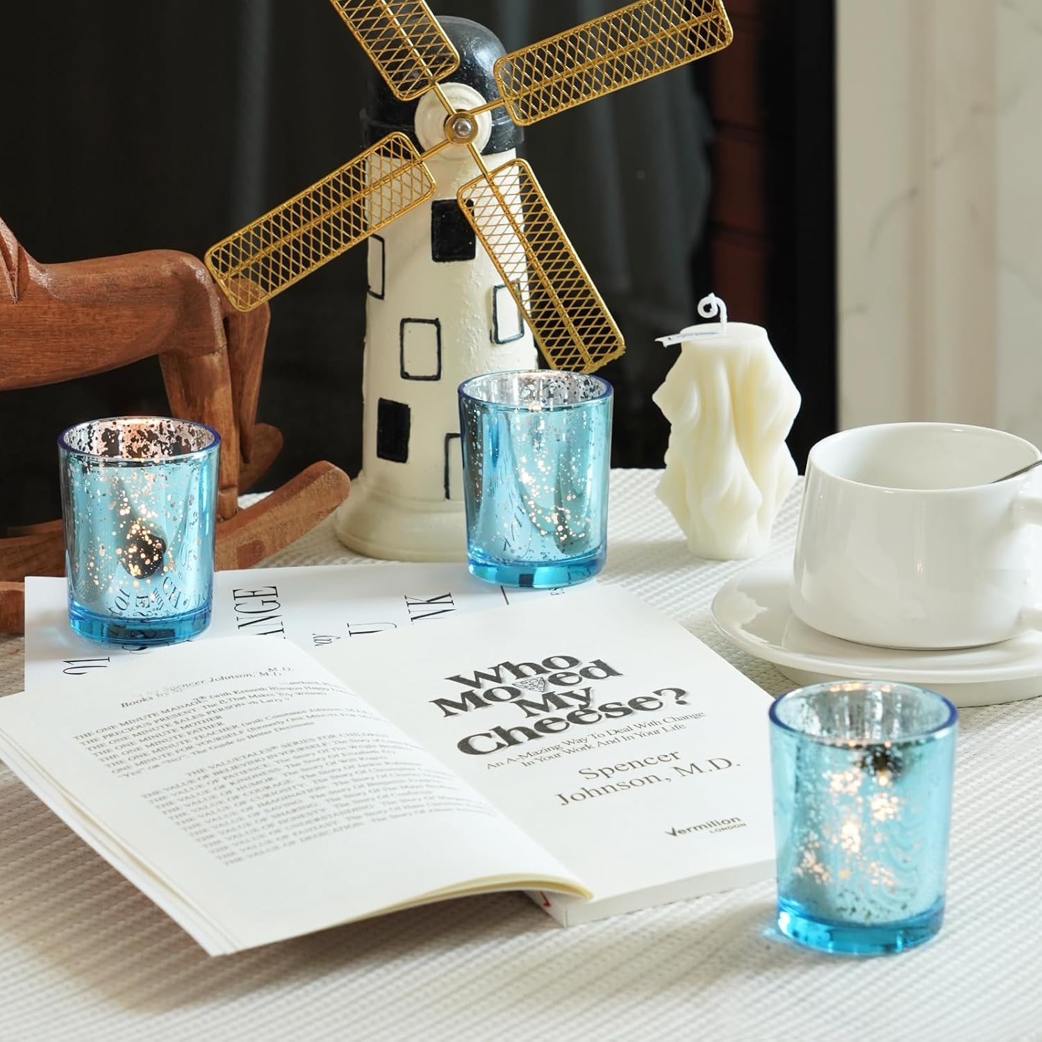 - Elevate Your Ambiance: Our stunning set of 12 blue mercury glass votive candle holders adds a dazzling touch to any setting. Light them up to watch the flickering glow dance, creating a cozy and elegant atmosphere perfect for gatherings, romantic dinners, or peaceful meditation