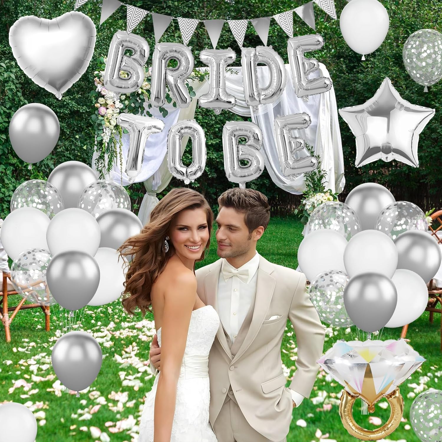 - Bachelorette Party Decorations: The white and silver bachelorette party decorations includes silver "BRIDE TO BE" letters balloons, silver foil balloons (star, heart)x 1, 12inch latex balloons (silver x 5, white x 4, metallic gold x 3, silver confetti x 3), diamond ring balloon x 1, silver banner x 1, glue point x 20, balloon ribbon x 1. Silver wedding decorations can be used as background decorations for the bride and friends and family.