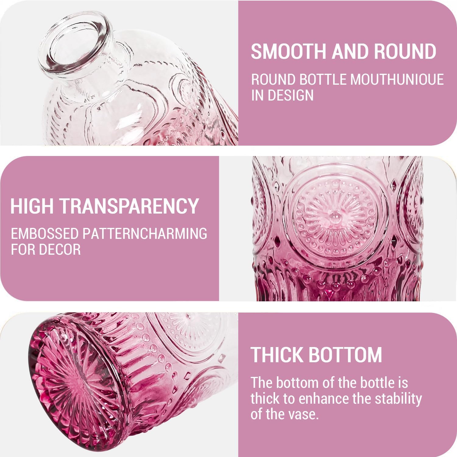 - đăTHICKENED MATERIALăThese charming small vases are made of thick and sturdy glass, durable and unbreakable. The patterned finish gives them. a textured look and sparkles in the light. Simply insert a flower stem and fill with water, stones or colored gems.