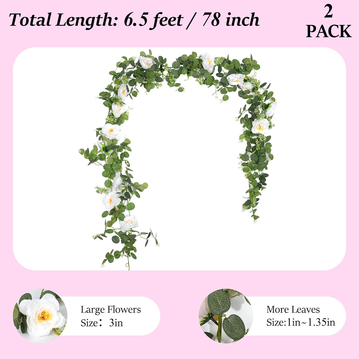 2 Pcs Total13Ft Eucalyptus Flower Garland with Fake Rose Flower, Artificial Fake Flowers Greenery Garland Floral Vines for Decoration Party Wedding Table Indoor Outdoor Backdrop Wall Decor(White)