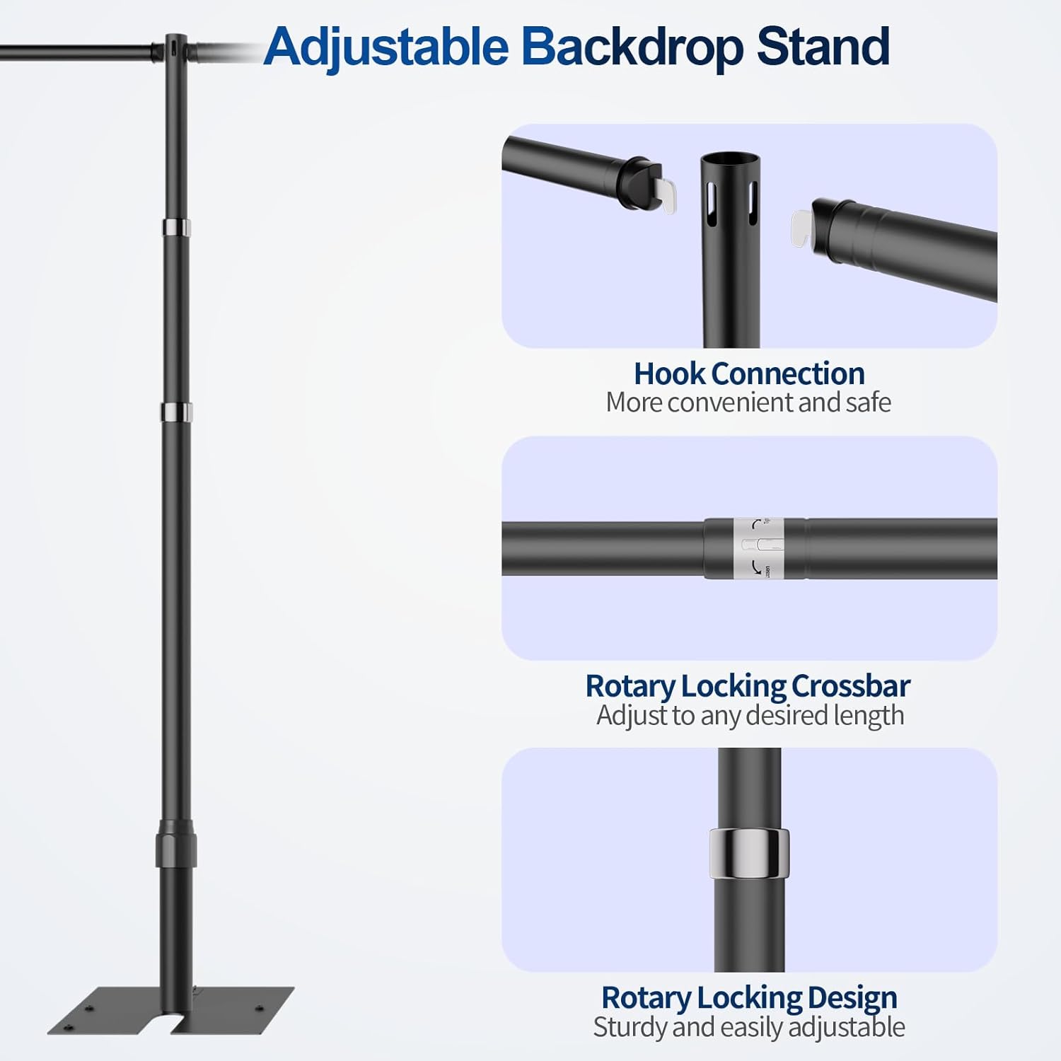- 【Adjustable Height & Width】 With adjustable height (4.5ft-10ft / 54in-123in) and width (7.8ft-20ft / 92in-240in). The 20x10ft backdrop frame are made up of telescopic rod, the upgraded rotary locking design makes it easy and quick to adjust to any desired size, which meet your mutiple need and create a wonderful background for wedding or party.