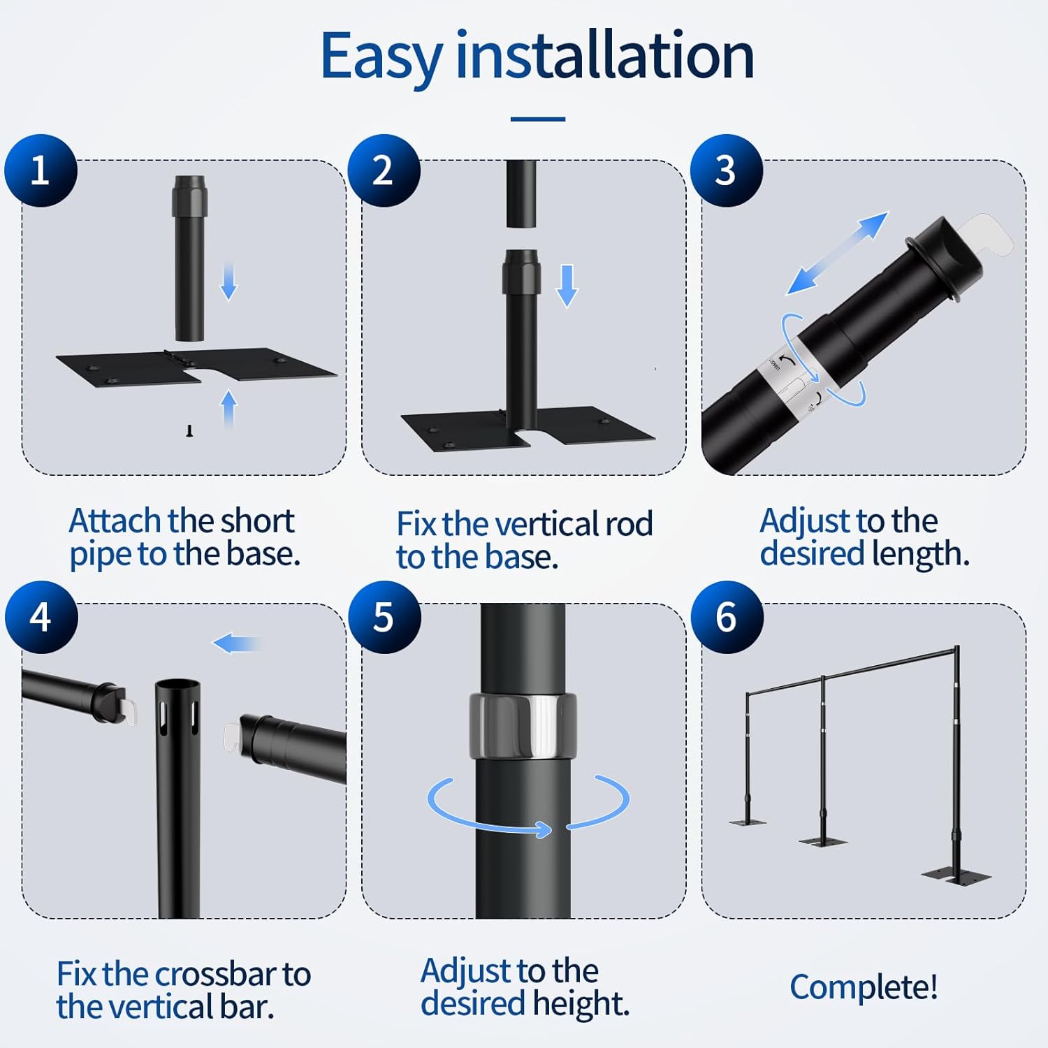 - 【Sturdy & Stable】 Thickened pipe and widened base provide greater load-bearing capacity and stability. The pipe and drape stand kit is made of high quality aluminum alloy featuring rust resistant, high strength and good gloss, which makes sure it's durable and sturdy enough.