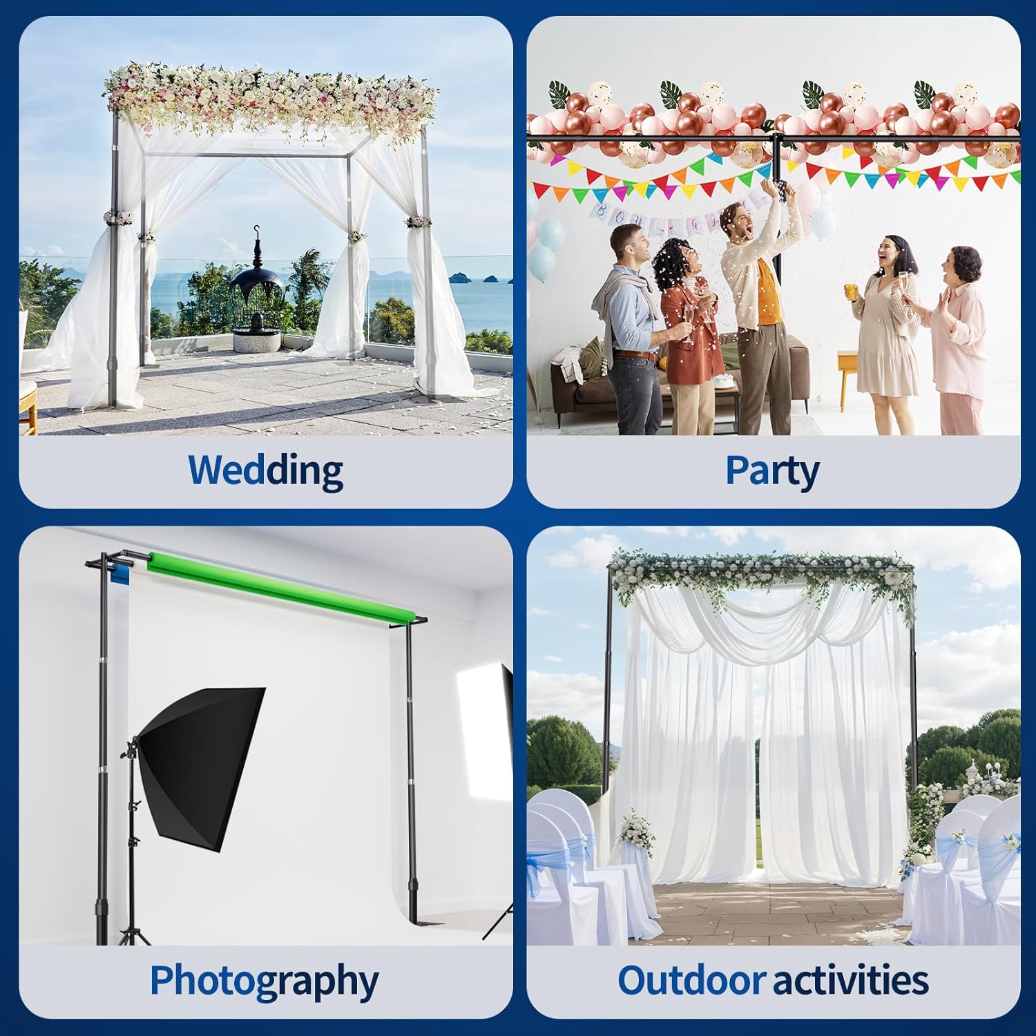 - 【Multiple Application】 Perfect for wedding, parties, birthday, photography, photo shooting, baby shower, exhibition, trade show, video studio, bid events and more indoor or outdoor occasions. You can hang curtains, backdrops, balloons, flower walls, vine walls, string lights and other decorations.