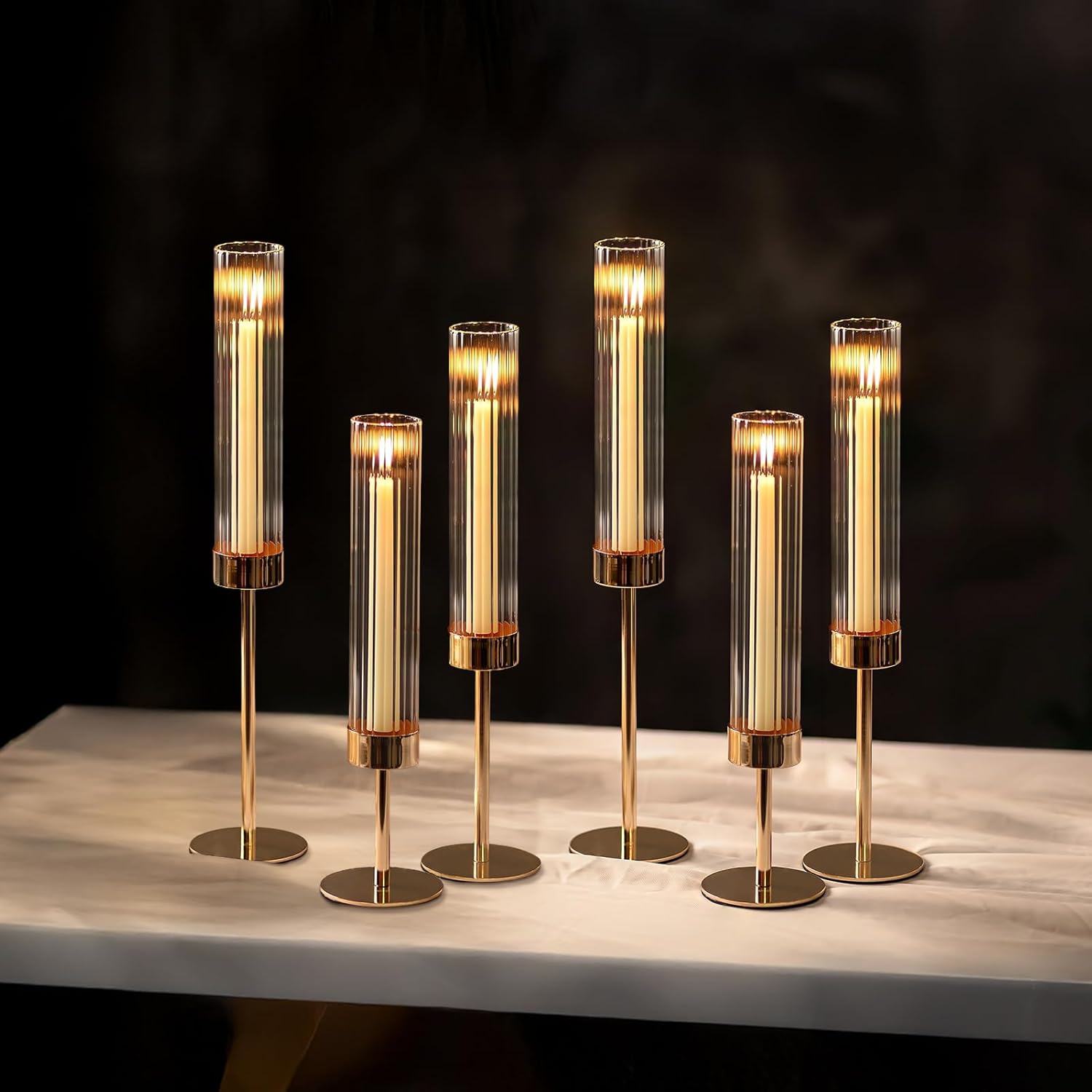 NUPTIO Hurricane Candle Holder for Centerpiece: Set of 6 Tall Candle Stick Holder with Ribbed Glass Cover - Bulk Fluted Taper Candlestick Decor for Living Room Thanksgiving Christmas