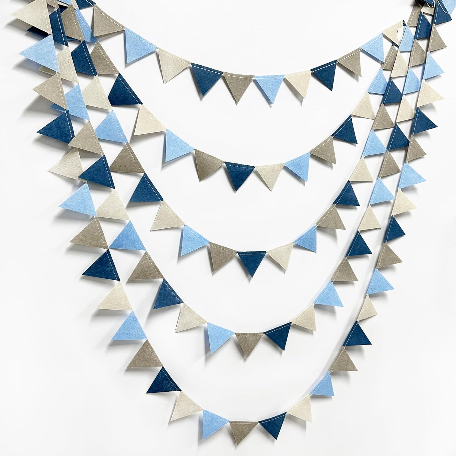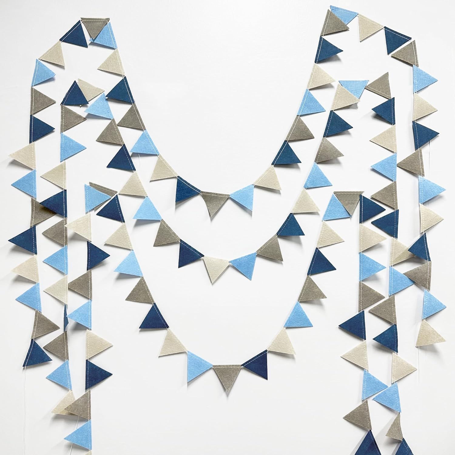 - Easy Assembly - Easy hanging and reusable.Perfect fit for grey blue party decor.unroll and unwrap garland carefully. due to delicate nature of thread, may tangle.This dusty blue mini triangle pennant makes an attractive backdrop for videos and photos.