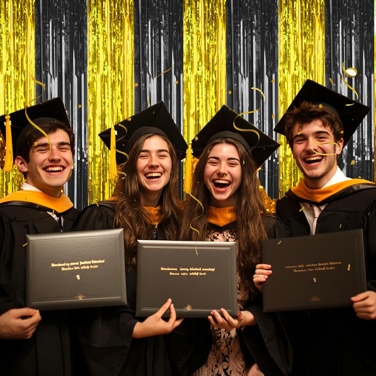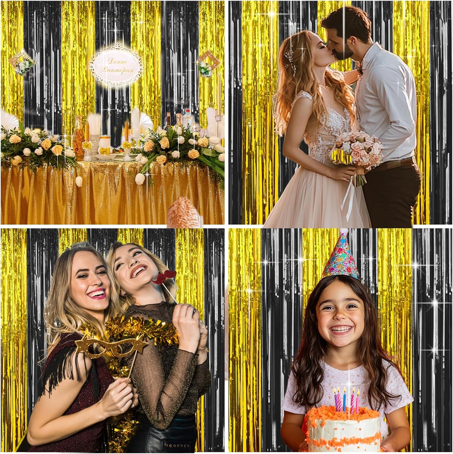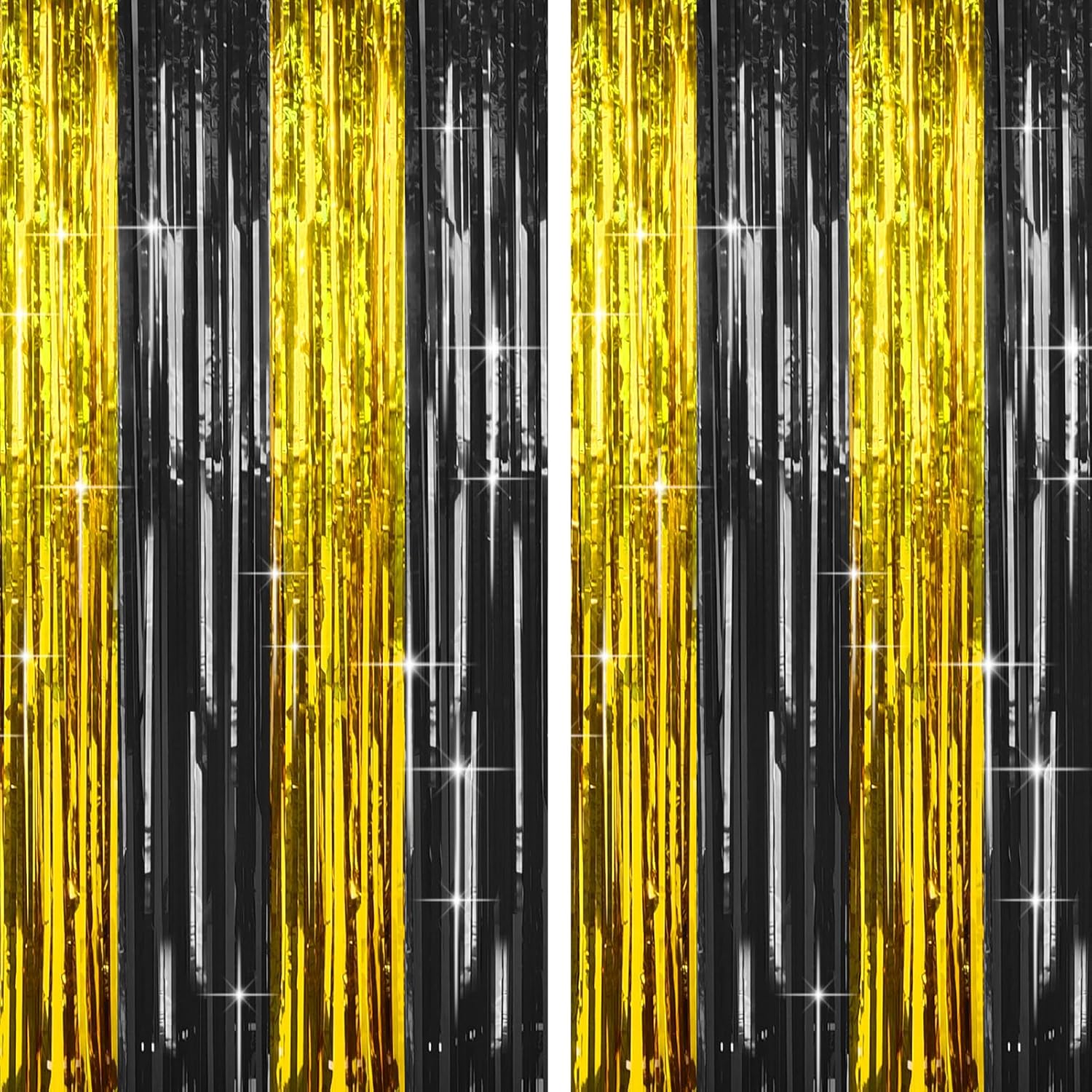 - Black and Gold Party Decorations: You will receive 4 pieces black and gold tinsel backdrop, each pack curtains size is 3.3ft x 6.6ft, enough length for decorate your party. These foil backdrop curtains are perfect for the door or wall to create an impressive decoration for parties, events, and photo booths.