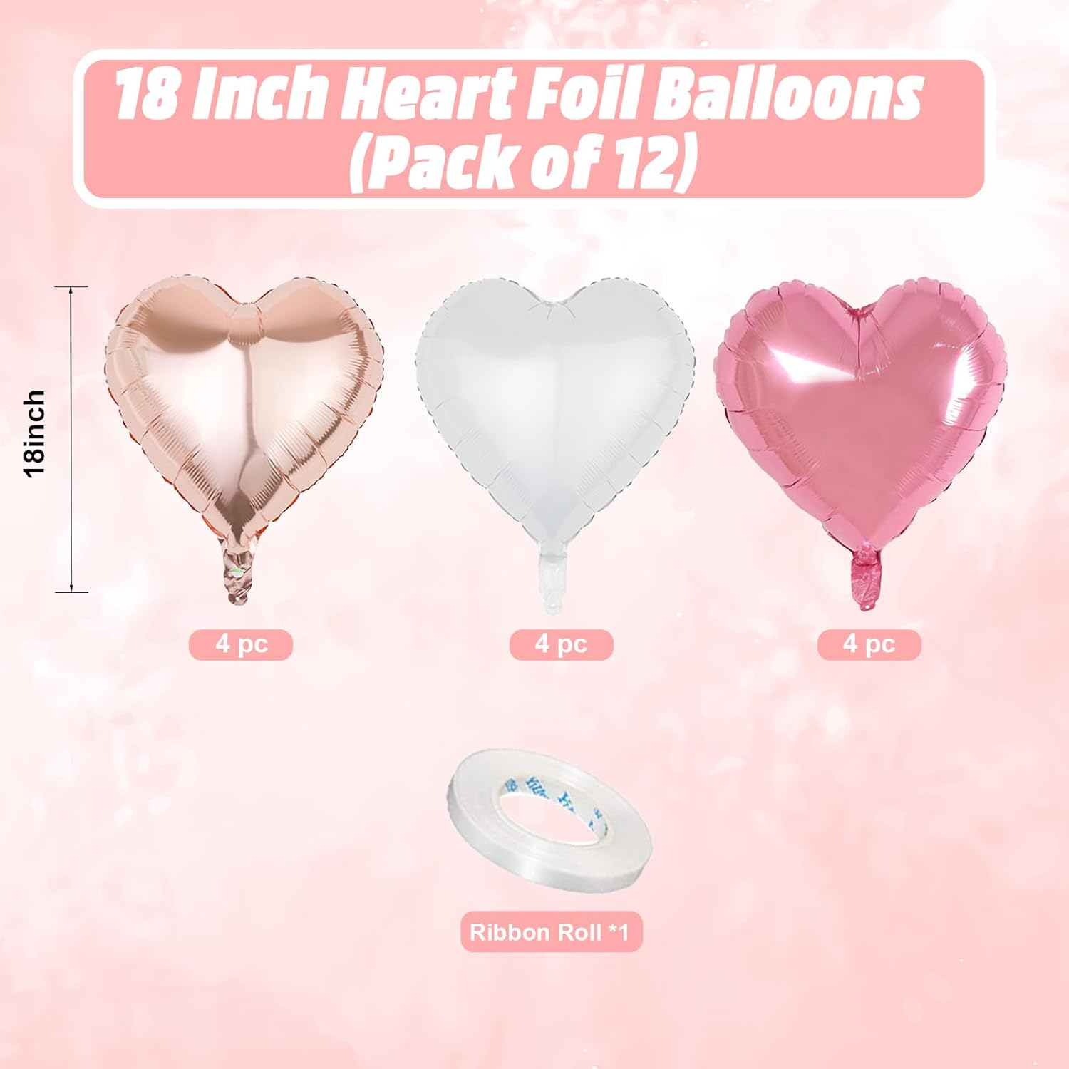 - Charming Pink White Rose gold Heart Balloons: Elevate your celebration with our set of 12 heart-shaped pink and rose gold balloons, each measuring 18 inches. Accompanied by a ribbon, these balloons are ideal for creating a festive and loving atmosphere at any special event.