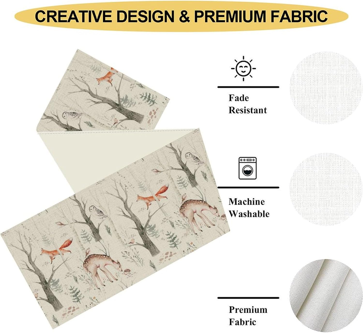 - Various Occasions: The cute table runner widely used in the kitchen, dining room, outdoor table, parties, birthday, or any other special occasion. Suitable for most rectangular table, round table and square table. The watercolor woodland table runners not only as dining table but also tea table, shoe cabinet, washing machine and TV stand, etc. It's also an ideal gift for Christmas, birthdays, weddings or parties as well.