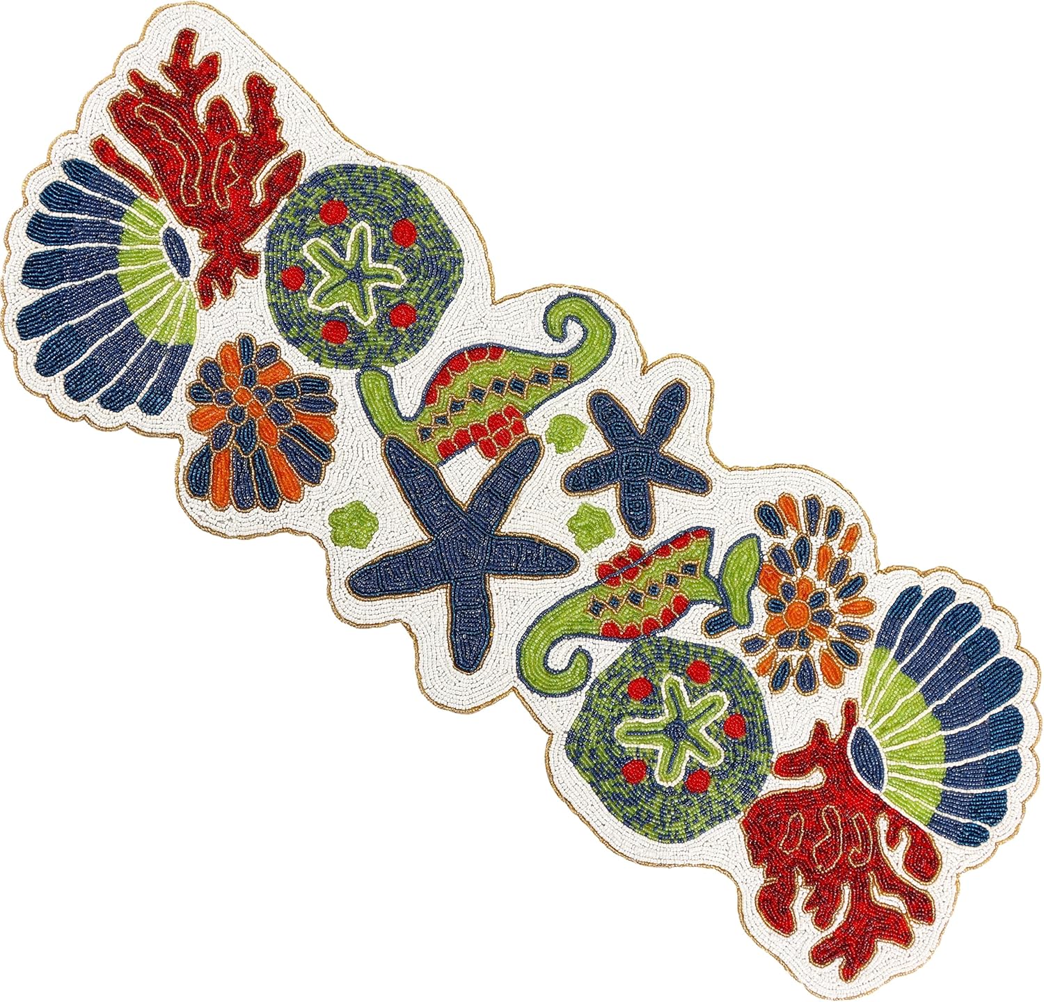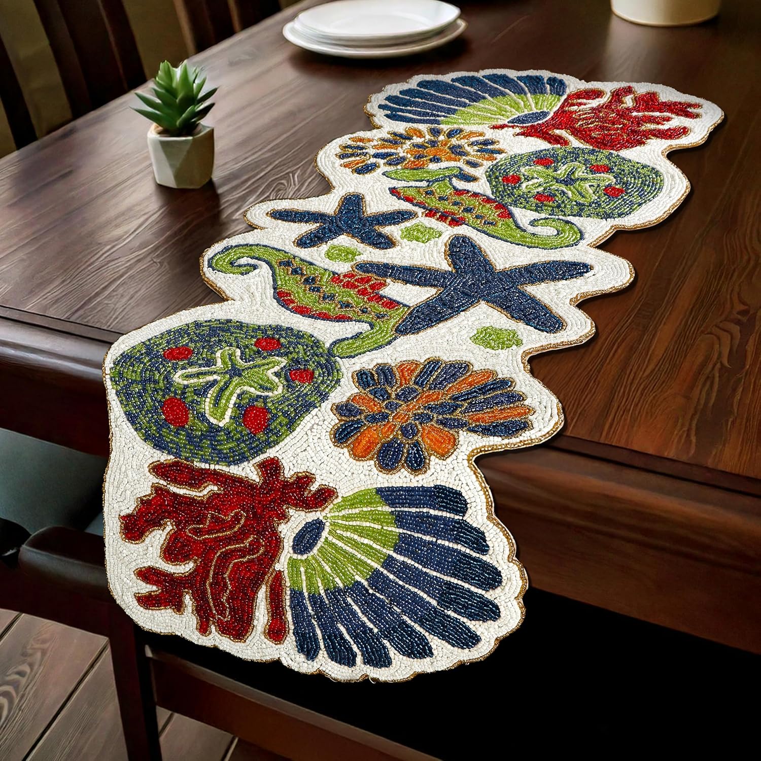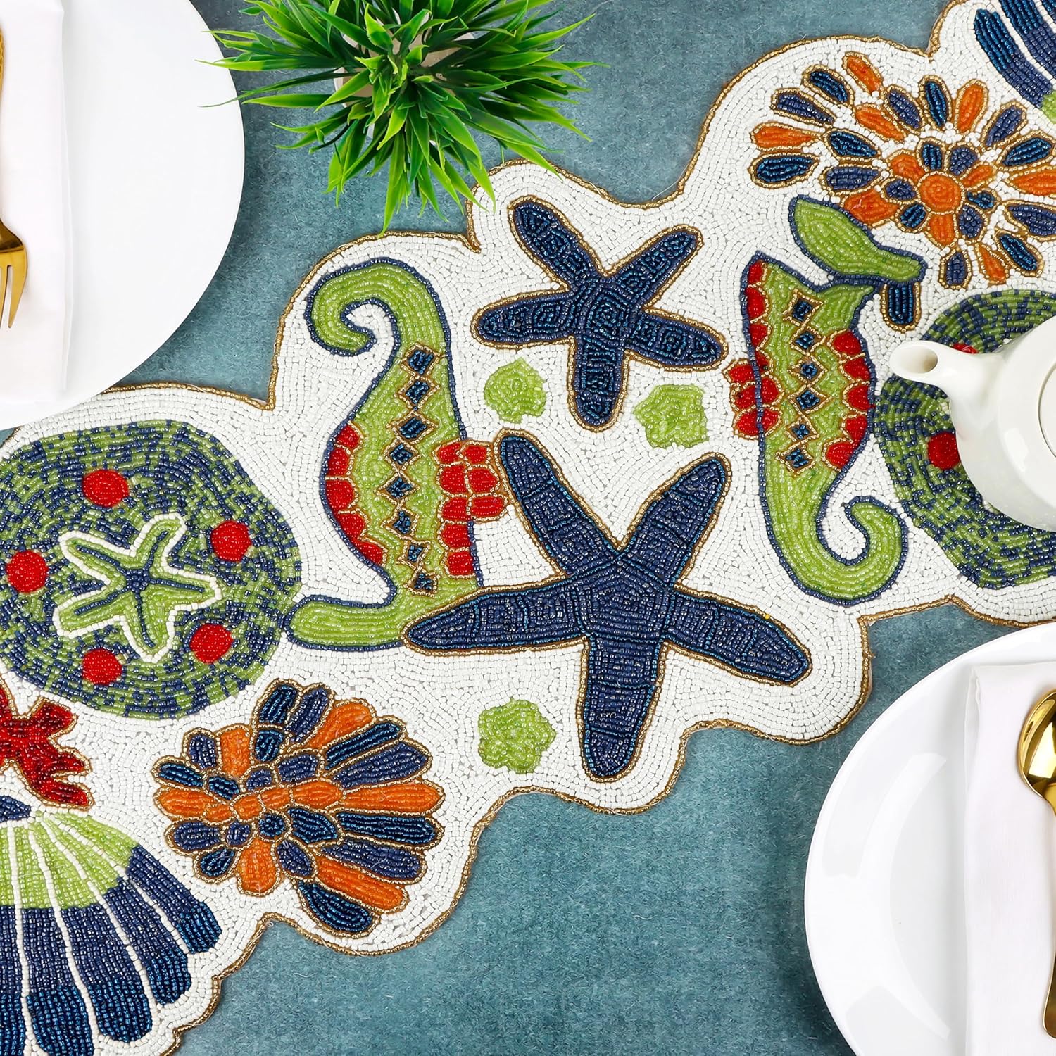 Handmade Beaded Coastal Table Runner -36" Ocean Theme Table Decor with Starfish, Seahorse, Coral, Shells -Nautical Table Centerpiece for Summer, Beach House, or Tropical Décor (Multi) - CLEENTABLE