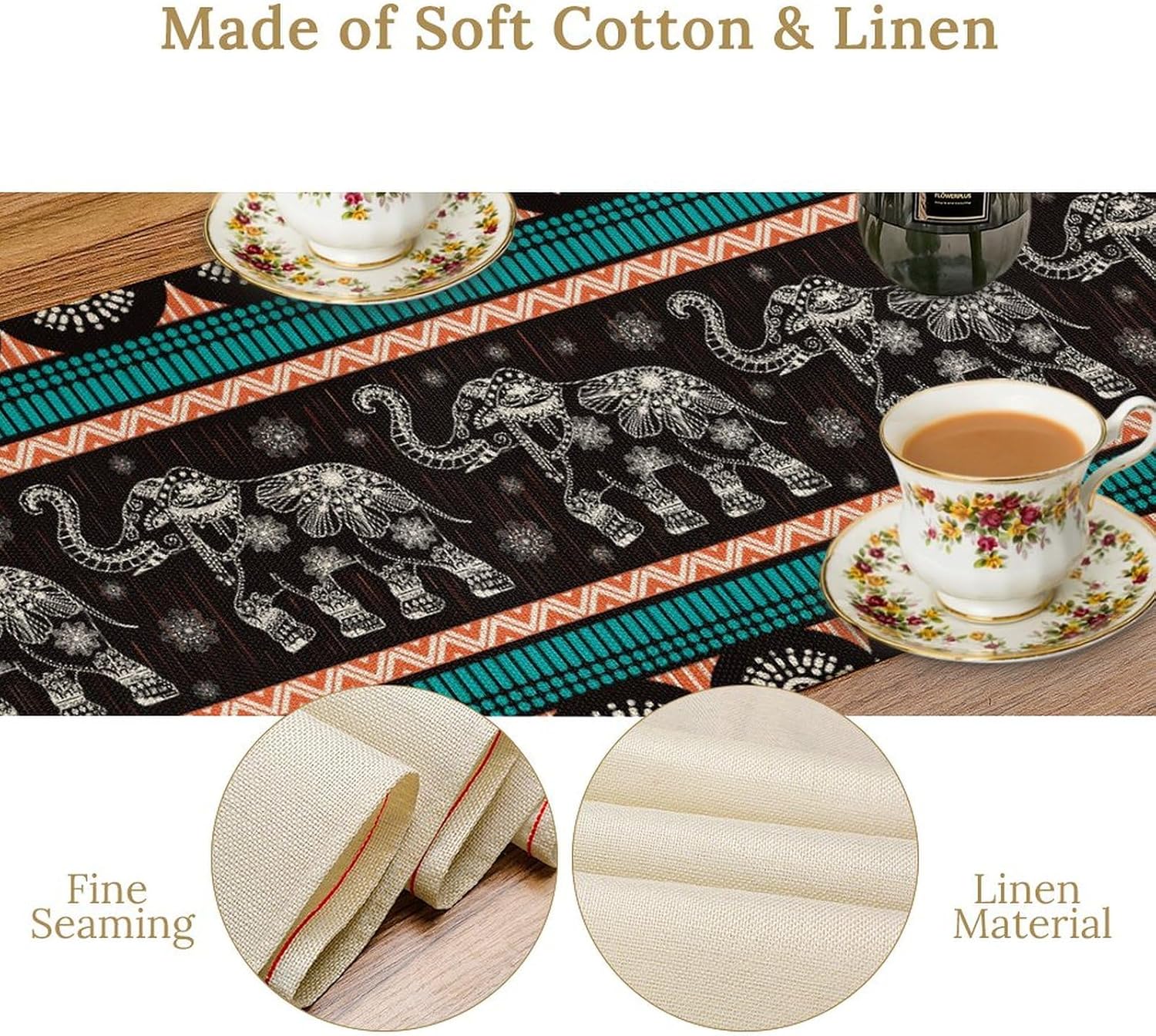 Boho Elephant Table Runner, Vintage Tribal Traditional Bohemian African Animals Ethnic Folk Table Center Decor for Home Kitchen Dining Patio Holiday Party Indoor Table Decorations, 13"x90" Inch