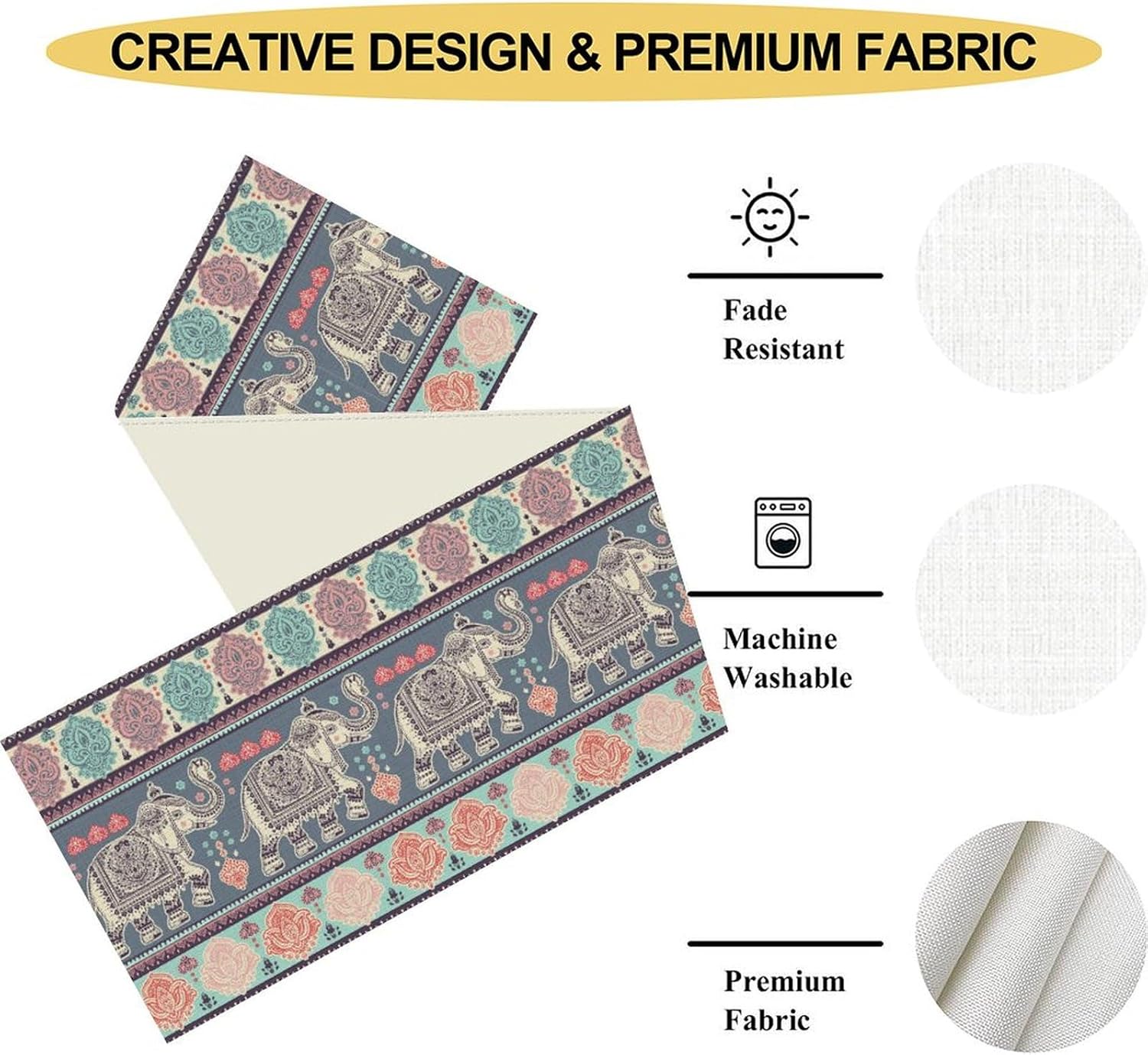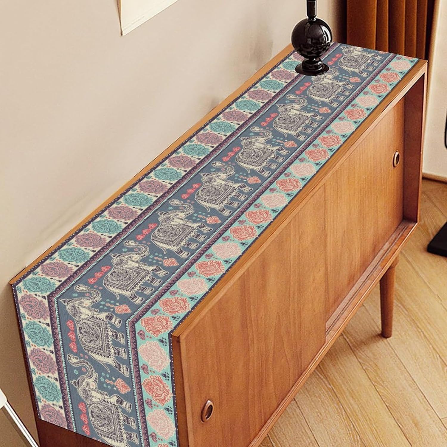Boho Table Runner, Indian Bohemian Elephant Mandala Paisley Floral Hippie Art Print Table Center Decor for Home Kitchen Dining Patio Holiday Party Indoor Outdoor Table Decorations, 13"x108" Inch