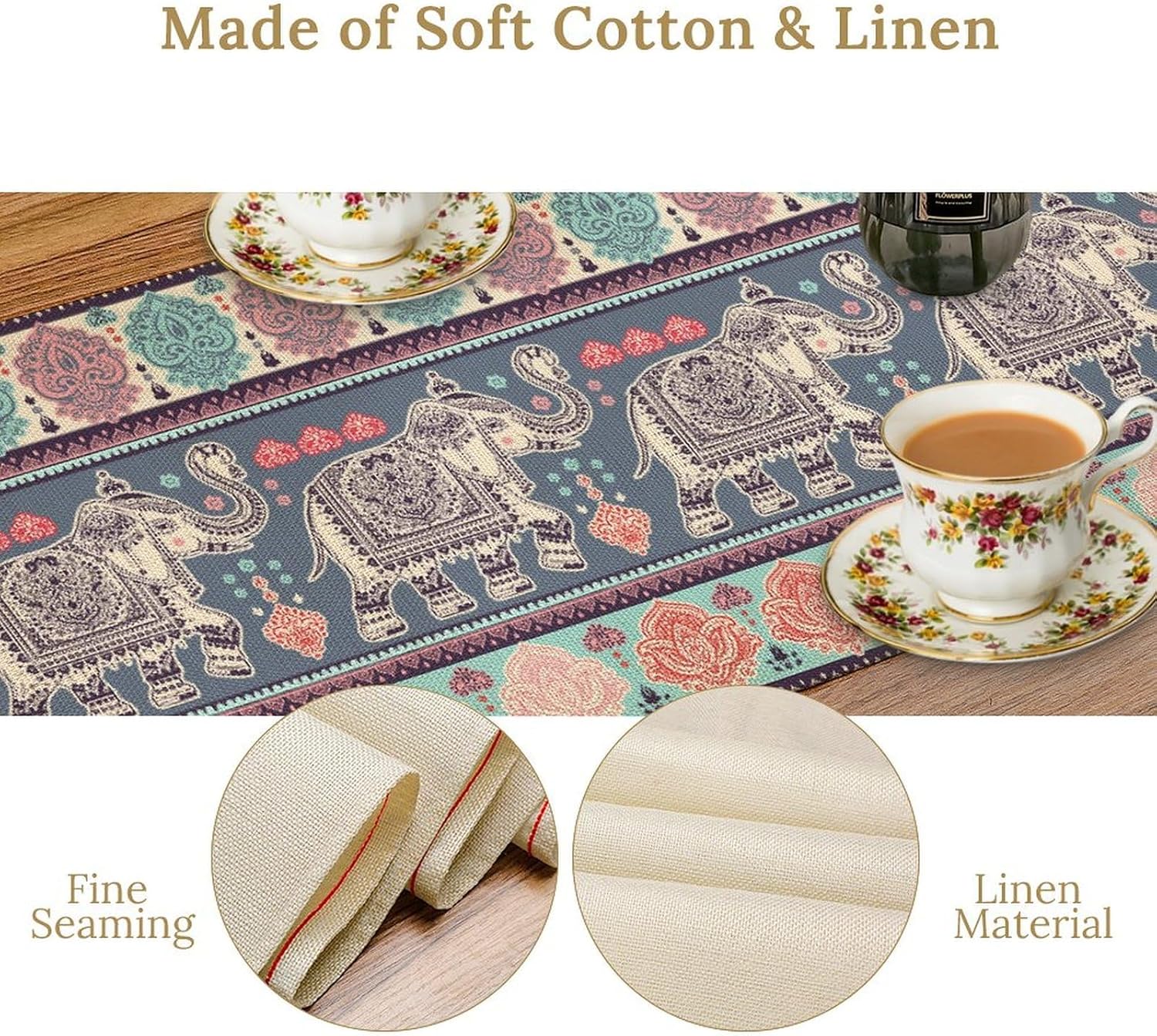 Boho Table Runner, Indian Bohemian Elephant Mandala Paisley Floral Hippie Art Print Table Center Decor for Home Kitchen Dining Patio Holiday Party Indoor Outdoor Table Decorations, 13"x36" Inch