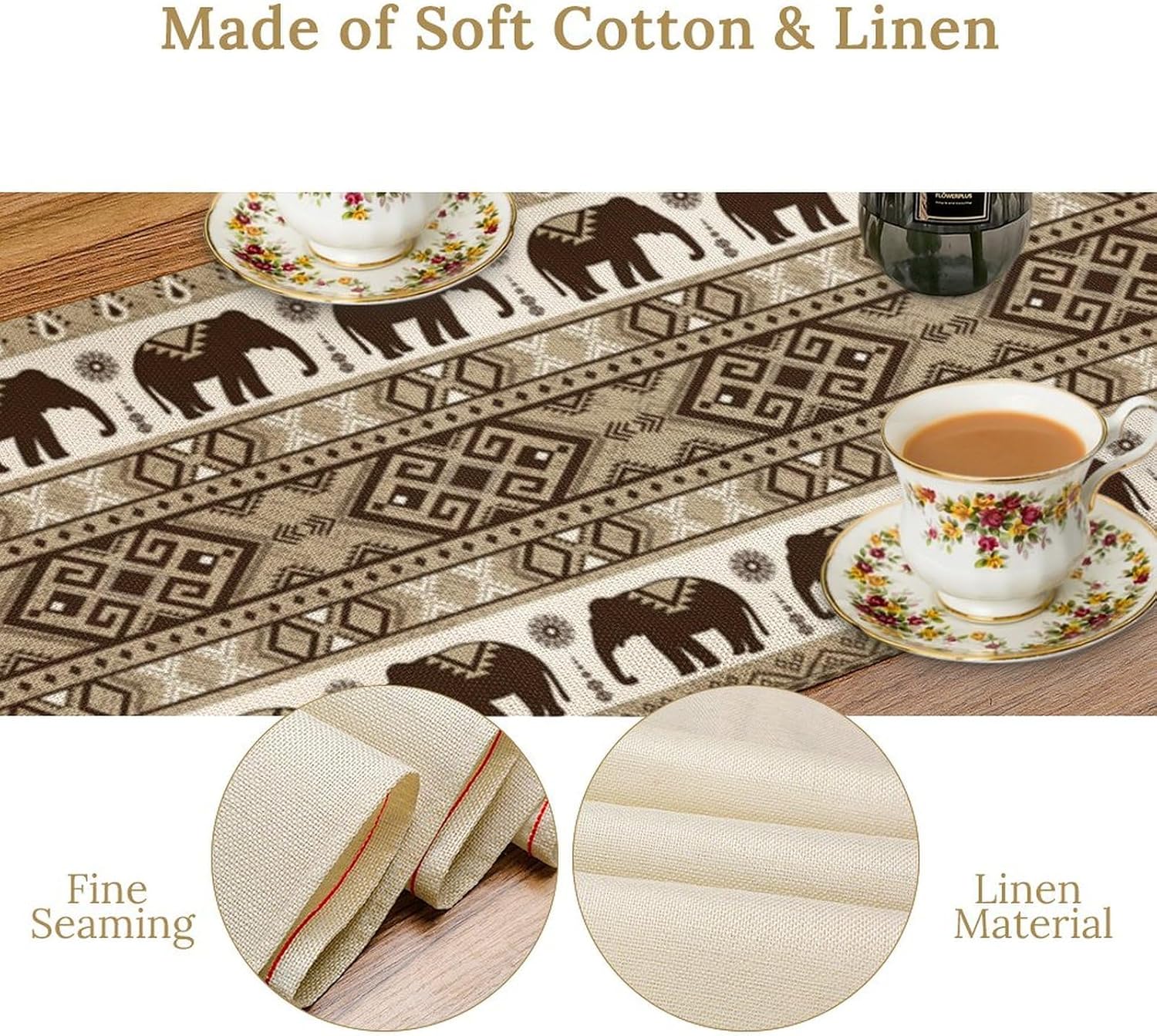Ethnic Table Runner, Rustic Farmhouse Boho Indian Bohemian Elephant Aztec Tribal Print Beige Table Center Decor for Home Kitchen Dining Patio Holiday Party Indoor Table Decorations, 13"x72" Inch