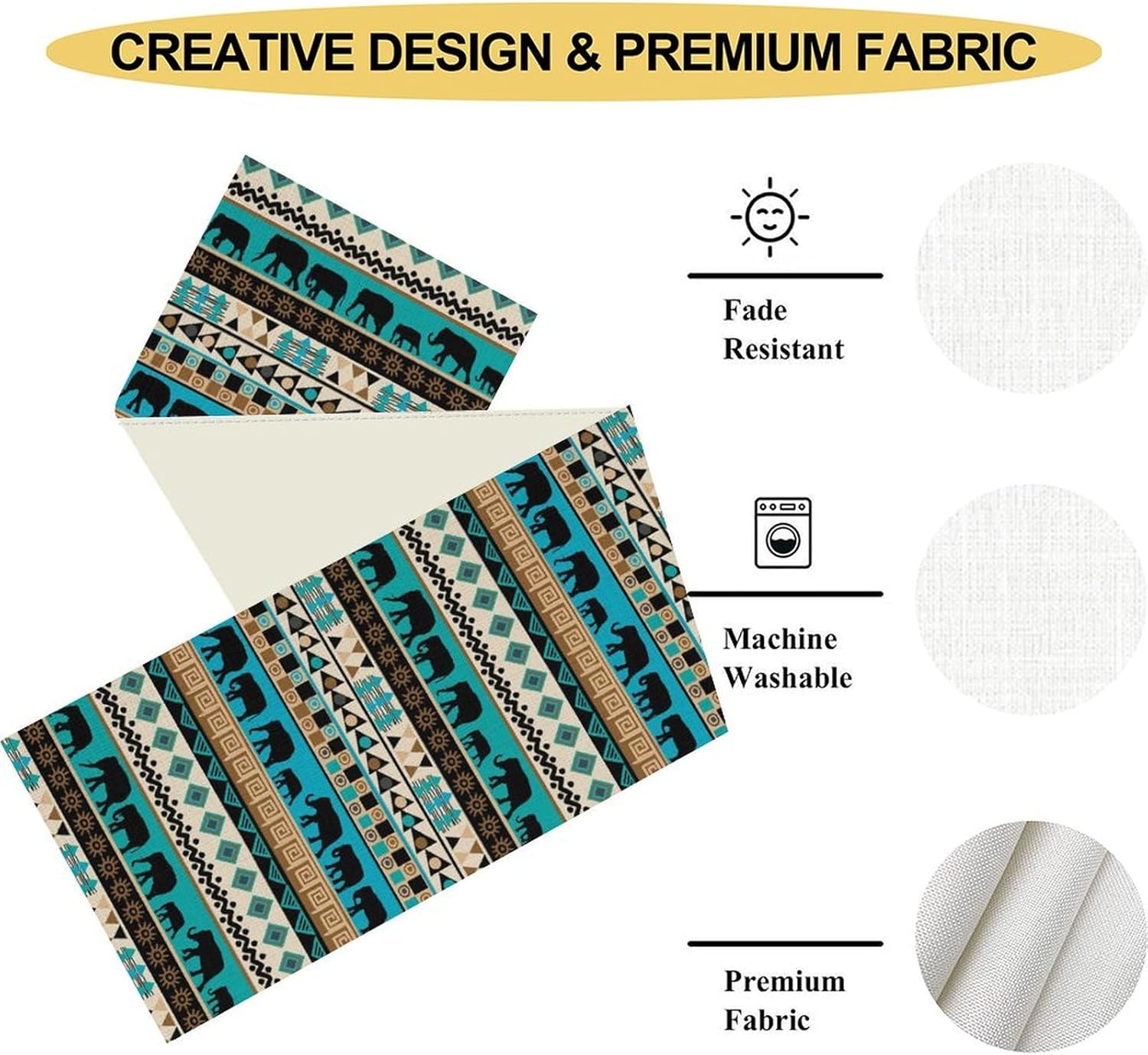 Boho Table Runner, Rustic Aztec Blue Teal African Elephant Tribal Ethnic Native Farmhouse Table Center Decor For Home Kitchen Dining Patio Holiday Party Indoor Outdoor Table Decorations, 13"x108" Inch