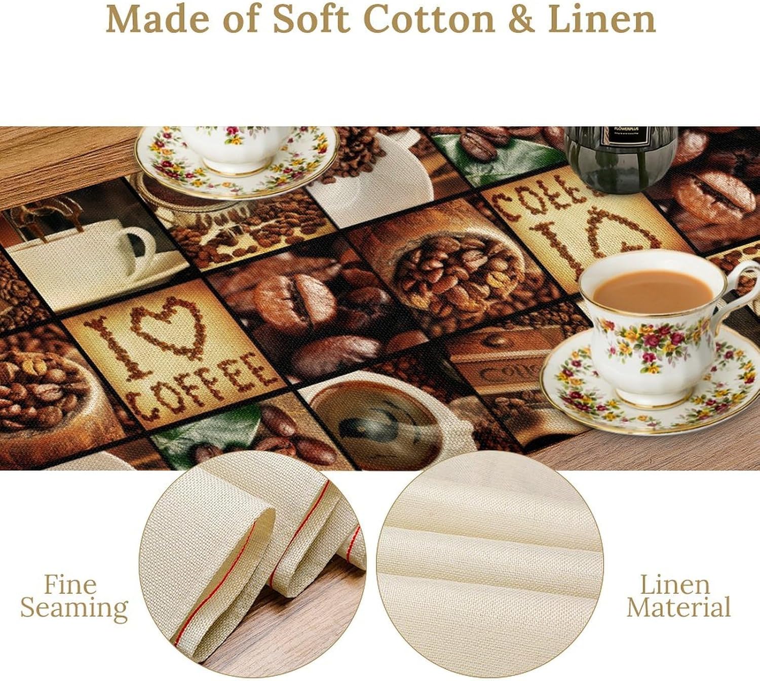 Coffee Theme Table Runner, Retro Farmhouse Coffee Cup Latte Cappuccino Tea Party Cafe Table Center Decor for Home Kitchen Dining Patio Holiday Party Indoor Outdoor Table Decorations,13"x36" Inch