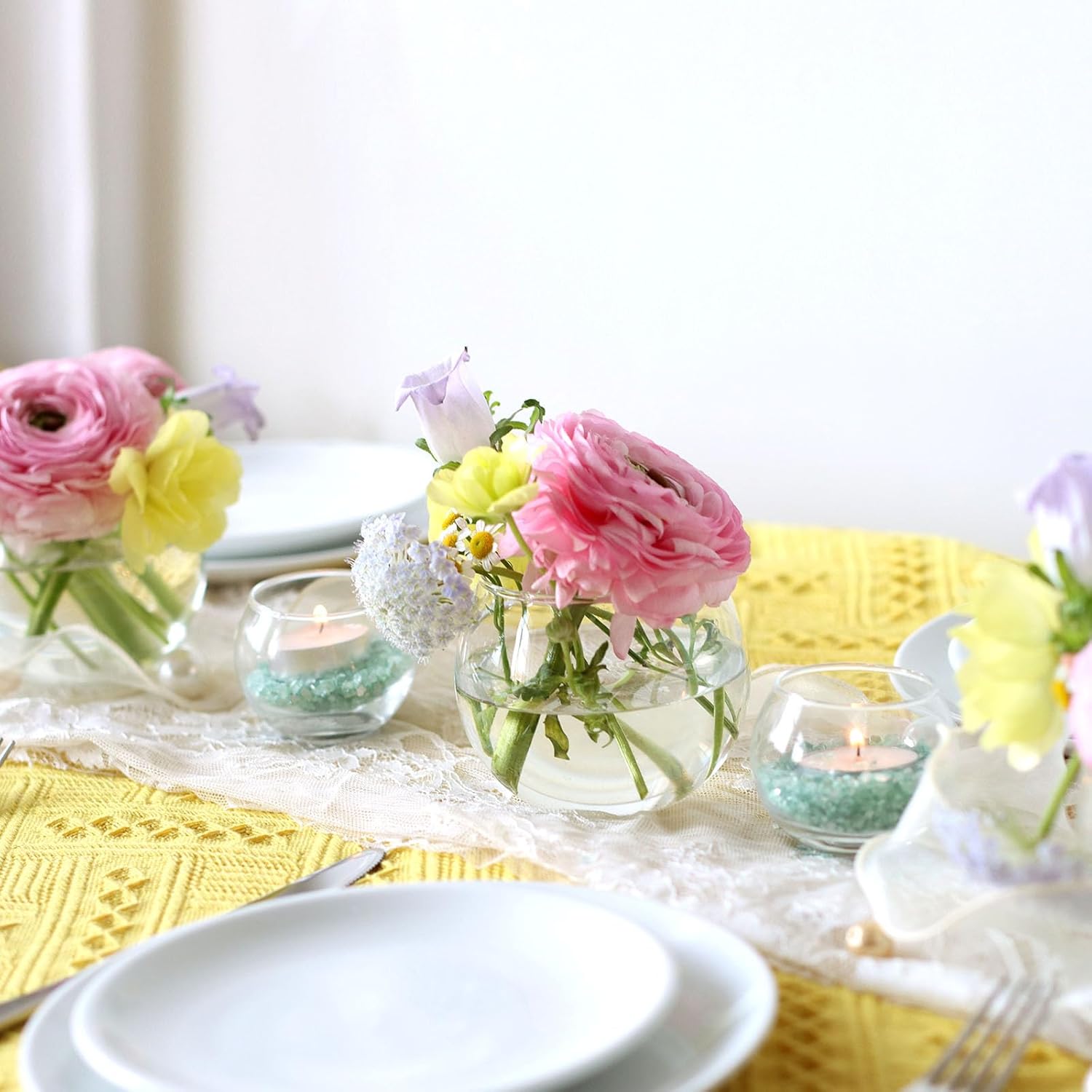 - 【Nice Combination Set】 package includes 4" W x3 " H(10*8cm) Set of 12 Pcs round glass vases, 2.6" W x2.2" H (6.7*5.6cm)Set of 12 Pcs Glass Candle Holders,With 2 sizes to match and multiple uses,can meet your use and centerpiece decoration needs easily.