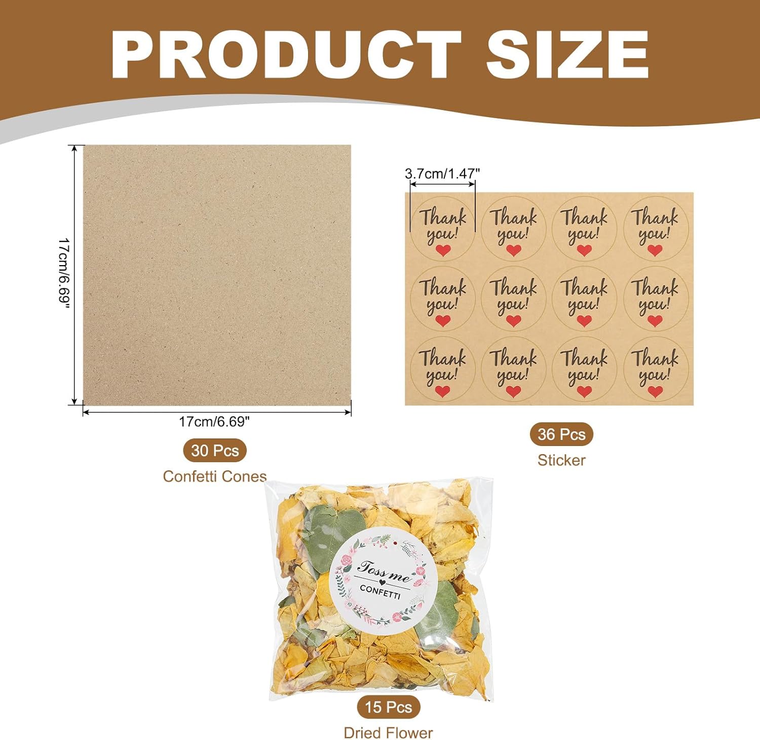 - Material: Paper; Color: Yellow/Green; Paper Cone Size: 17 x 17 cm / 6.69 x 6.69 inch (LxW); Sticker Diameter: 3.7 cm / 1.47 inch; Dried Flower Weight: 160 g / 3.4 qt / 5.75 oz; Package List: 30 Pcs x Confetti Cones, 15 Pcs x Dried Flower, 36 Pcs x Sticker