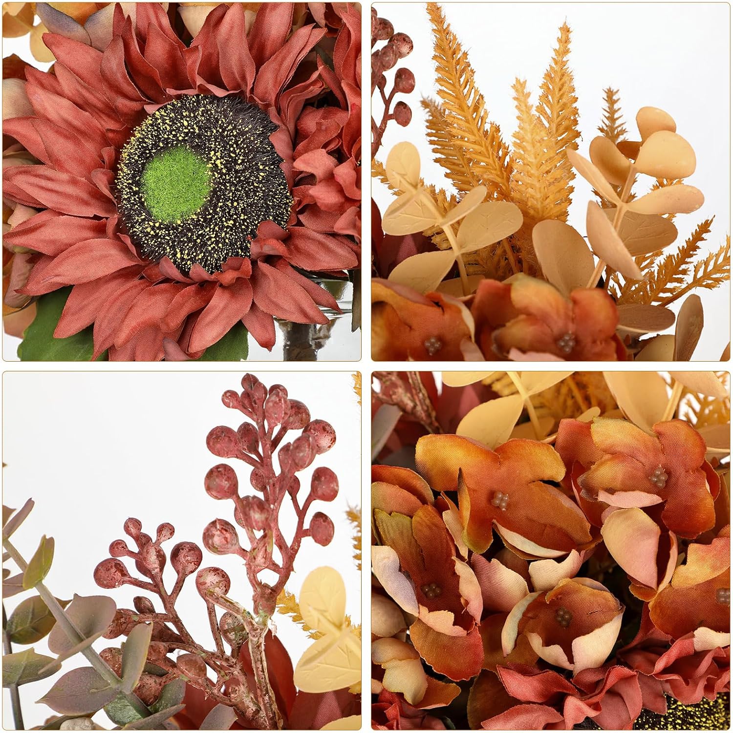 - Mason Jar Centerpieces - This fall centerpieces for tables features lifelike orange red sunflowers with green centers, complemented by green foliage, burnt orange hydrangeas, eucalyptus leaves, and natural textured wheat stems. Each silk petal showcases delicate veining for authentic realism. The sunflower bouquet is securely placed in a classic glass mason jar, creating a perfect farmhouse autumn centerpiece for Thanksgiving, harvest festivals, or seasonal home styling