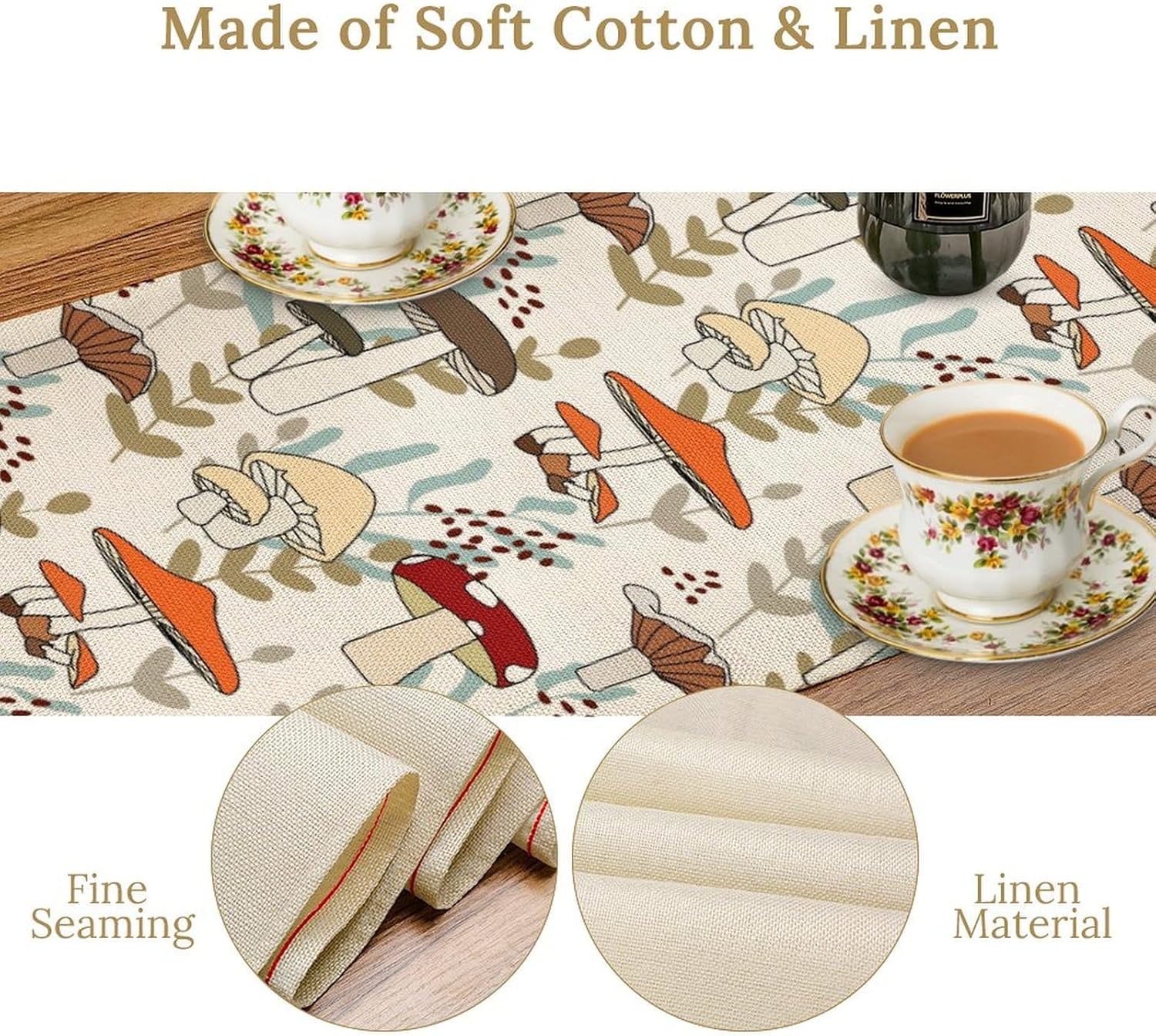 Mushroom Table Runner, Vintage Nature Plant Table Runner for Farmhouse Kitchen Dining Table Decoration for Home Party Decor 13x60 Inch