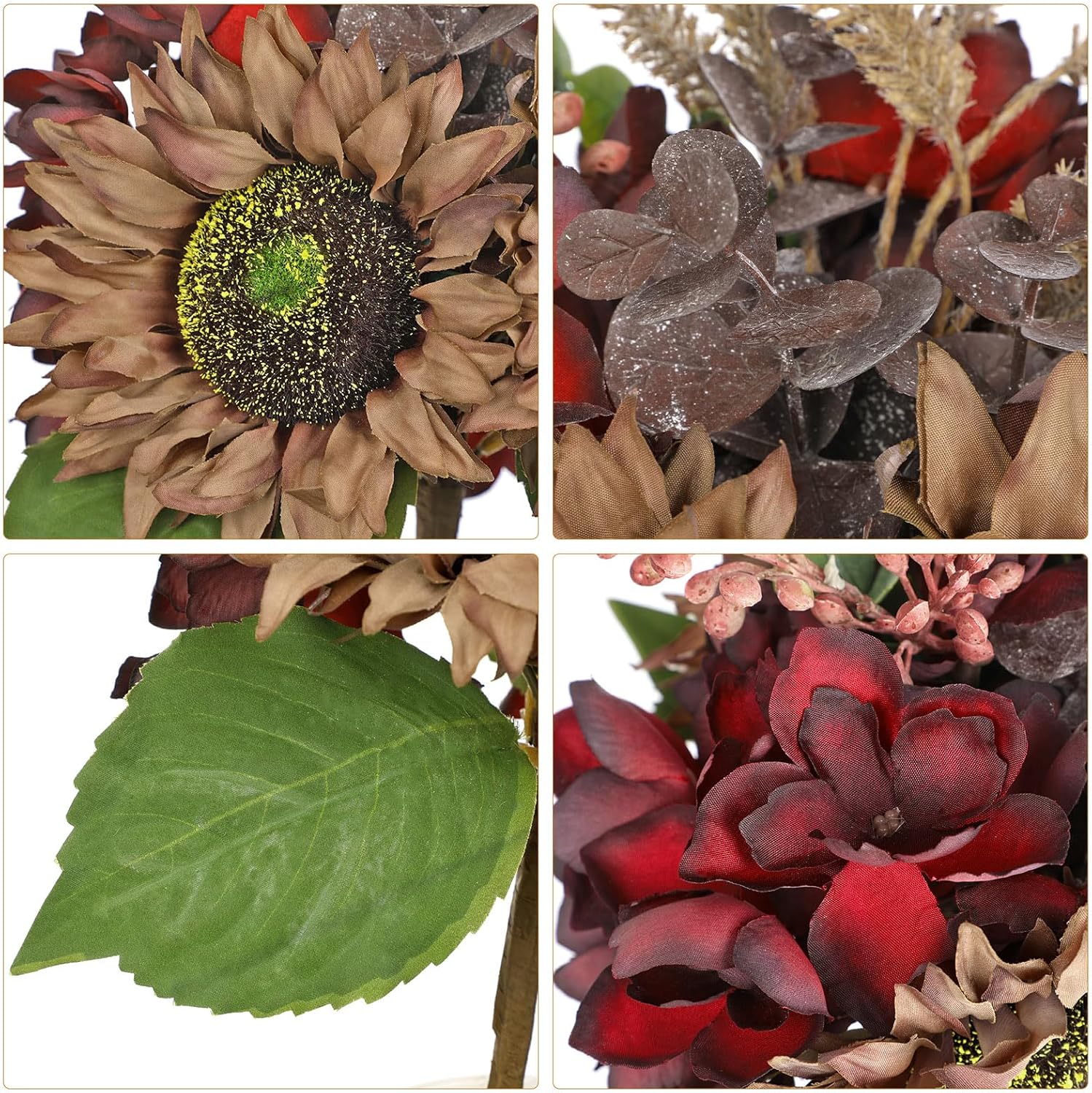 - Mason Jar Centerpieces - This fall centerpieces for tables features lifelike brown sunflowers with green yellow centers, complemented by deep red peony blooms, frosted eucalyptus leaves, and natural textured wheat stems. Each silk petal showcases delicate veining for authentic realism. The sunflower bouquet is securely placed in a classic glass mason jar, creating a perfect farmhouse autumn centerpiece for Thanksgiving, harvest festivals, or seasonal home styling
