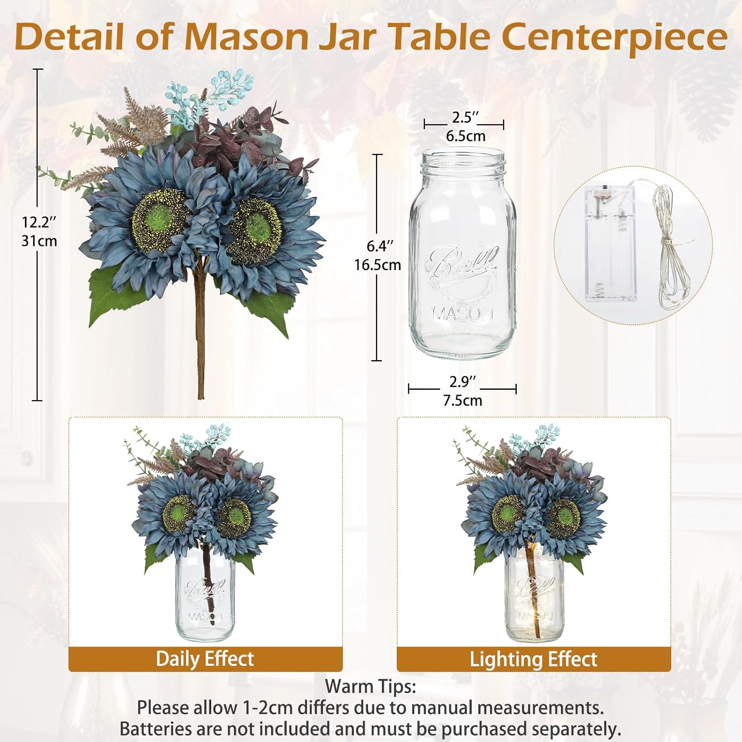 - Fall Artificial Flowers Indoors - The overall height of the autumn flowers is 12.2", and the mason jar's size is 2.9"(D)x6.4"(H),this piece fits perfectly on tables, mantels, shelves, windowsill and entryways. The autumn inspired color palette complements farmhouse, rustic, and modern styles. Use it as a table centerpiece, detach the bouquet for vase displays or DIY projects, or highlight it at weddings and seasonal events. It works beautifully solo or paired with pumpkins/seasonal accents
