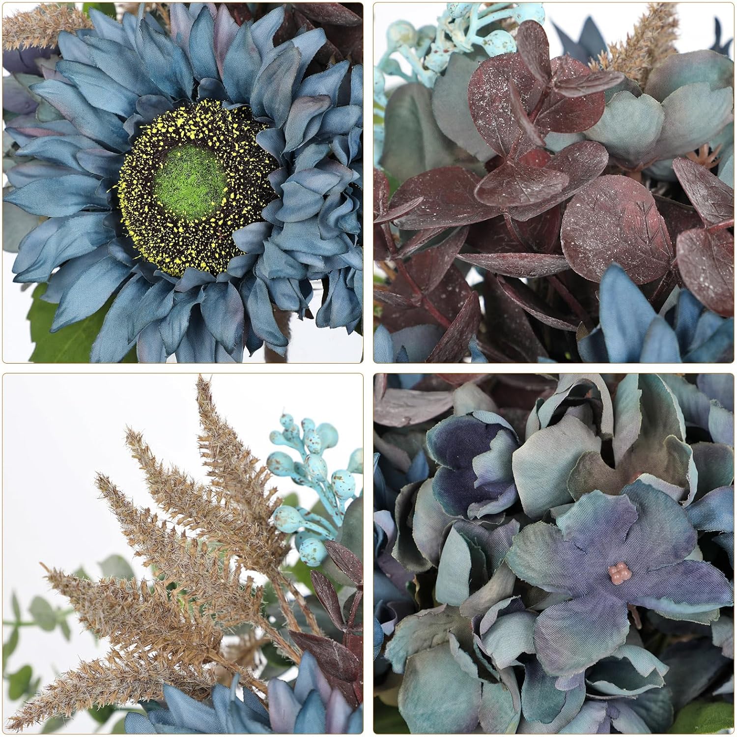 - Mason Jar Centerpieces - This fall centerpieces for tables features lifelike blue sunflowers with green centers, complemented by green foliage, blue hydrangeas, dark red eucalyptus leaves, and natural textured wheat stems. Each silk petal showcases delicate veining for authentic realism. The sunflower bouquet is securely placed in a classic glass mason jar, creating a perfect farmhouse autumn centerpiece for Thanksgiving, harvest festivals, or seasonal home styling