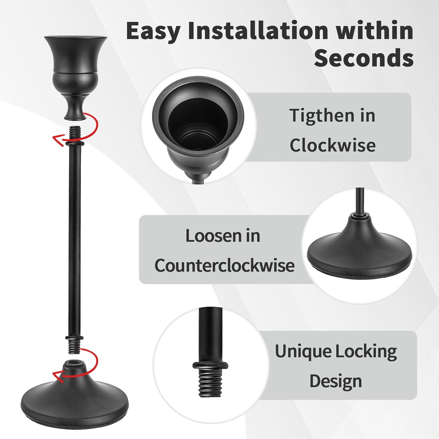 - [Stable Sturdy Secure]: Our tapered candle holder is made of high quality aluminum alloy material.The bottom of each candlestick holders is equiped with non-slip pads to increase friction while protecting your desktop from scratches and damage.It ensures stability and longer lifetime for your candles.Also we add metal ring to rod, which makes the installation more user-friendly and easier.